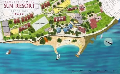 Hunguest Hotel Sun Resort является комплексом гостиниц, протяженностью 400 м состоит из 5 гостиничных корпусов и 4 зданий, в кот. находятся апартаменты, расположенным на площади свыше 2 га и в непосредственной близости к побережью моря и променаду, а также в 5 минутах ходьбы от исторического центра Герцег-Нови.