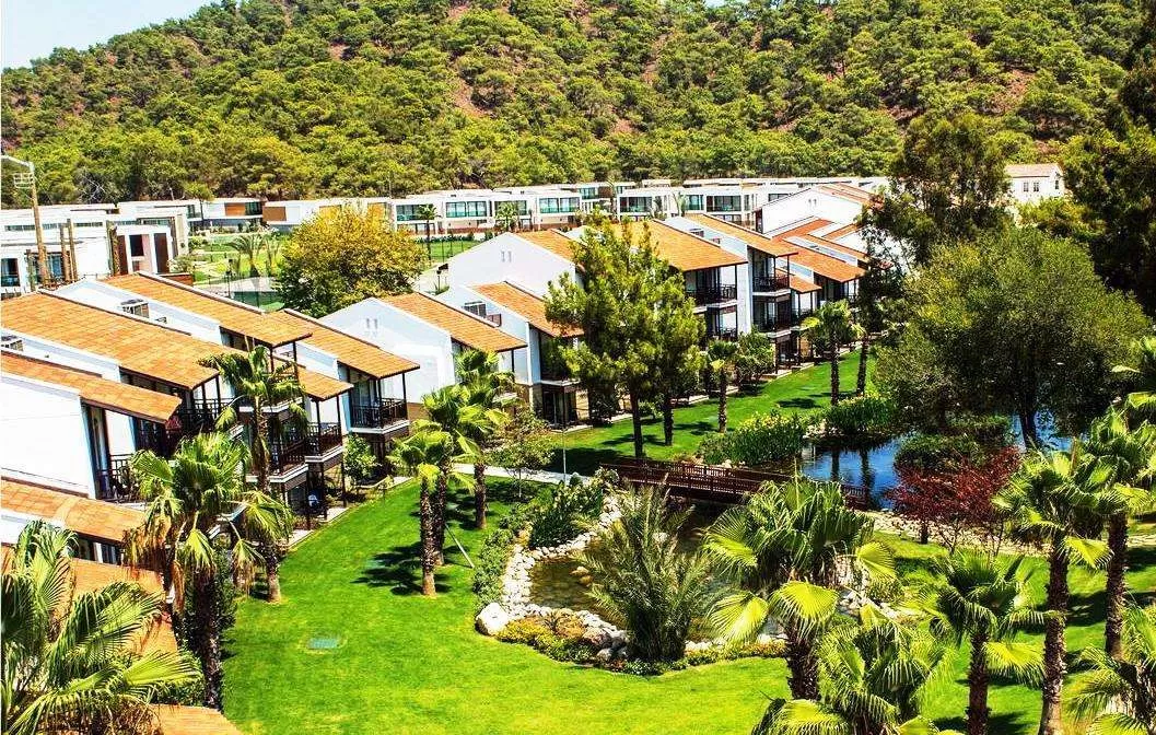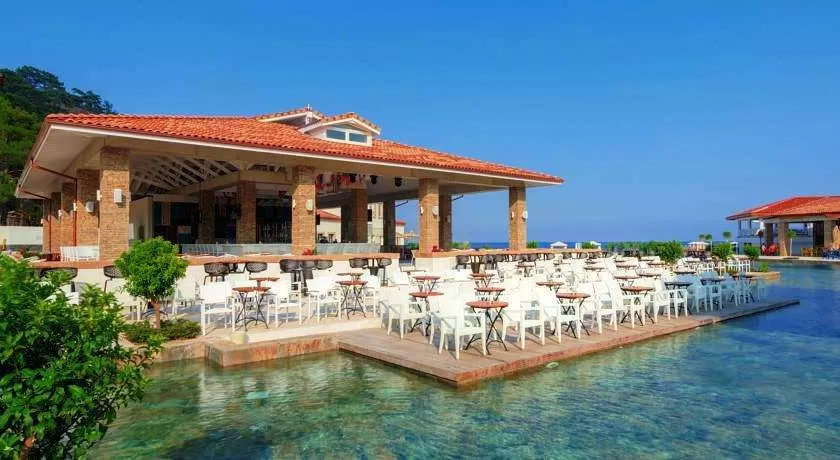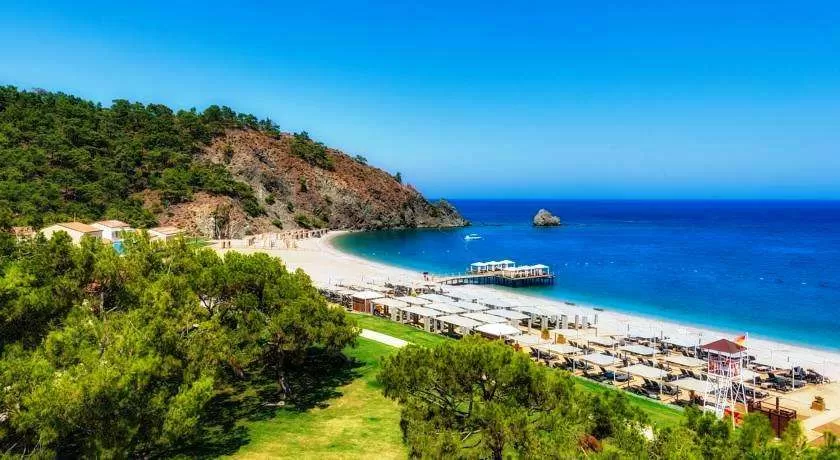 73 км от аэропорта г. Анталья, в 17 км от г. Кемер, в поселкe Текирова, на самом берегу моря.