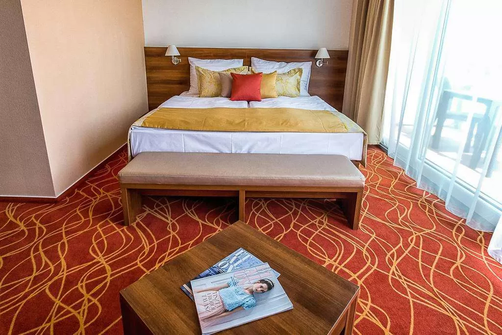 • Общая площадь 43 м2, современные и роскошные апартаменты. По прибытию, в комнате гостей ожидает приветственный подарок.В люксах - двуспальные кровати размера King -size, с террасы открывается великолепный вид на Хевиз и пешеходную улицу. Две ванные комнаты с джакузи , оформленные в современном стиле, с коместическими наборами Премиум класса. Дополнительная кровать преусмотрена.