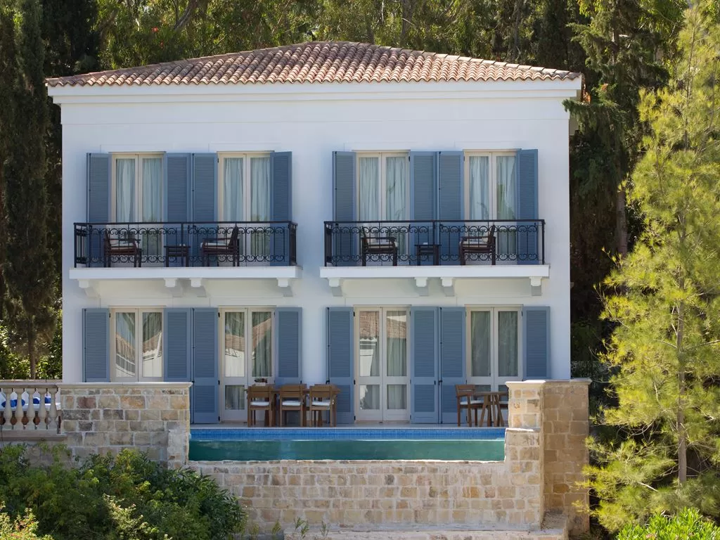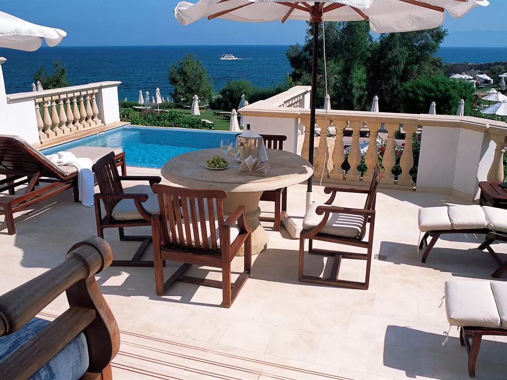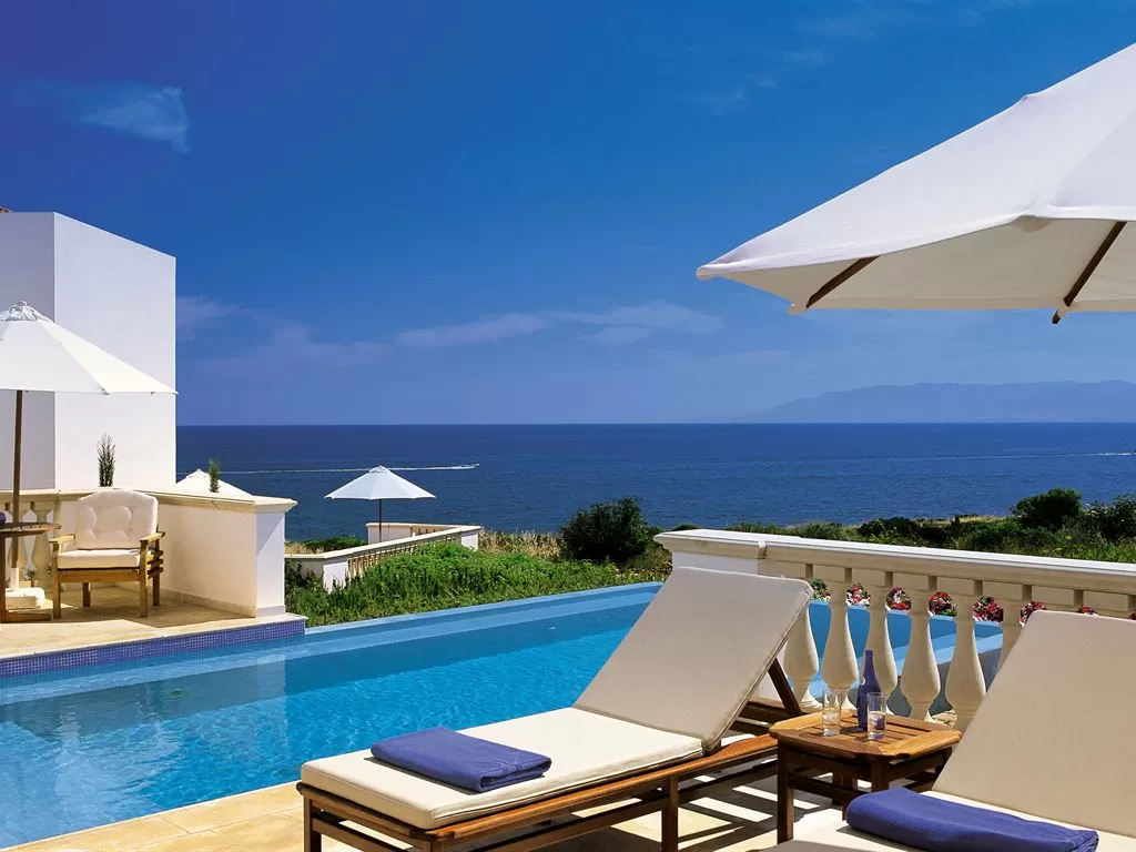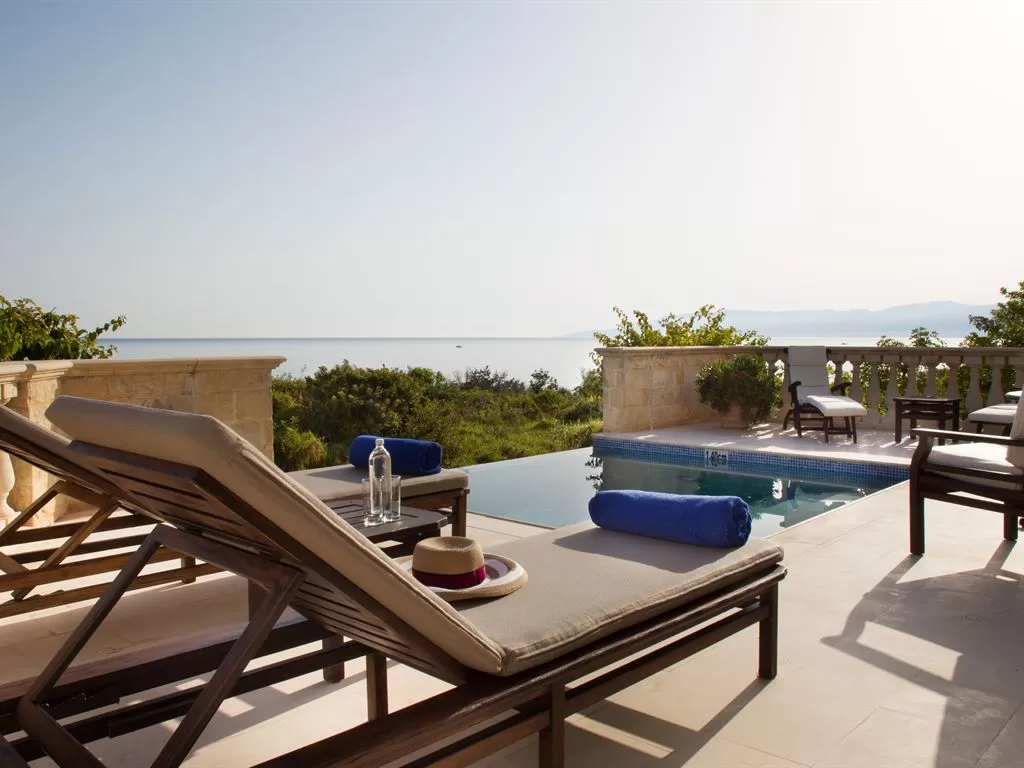 Junior Suite Private Pool. Сьют расположен в главном здании или в саду. Дизайн номера в средиземноморском стиле, просторная гостиная зона, вид на море и терраса с бассейном (~12.8m²; с подогревом зимой). Дополнительно: угощения от шеф-повара.