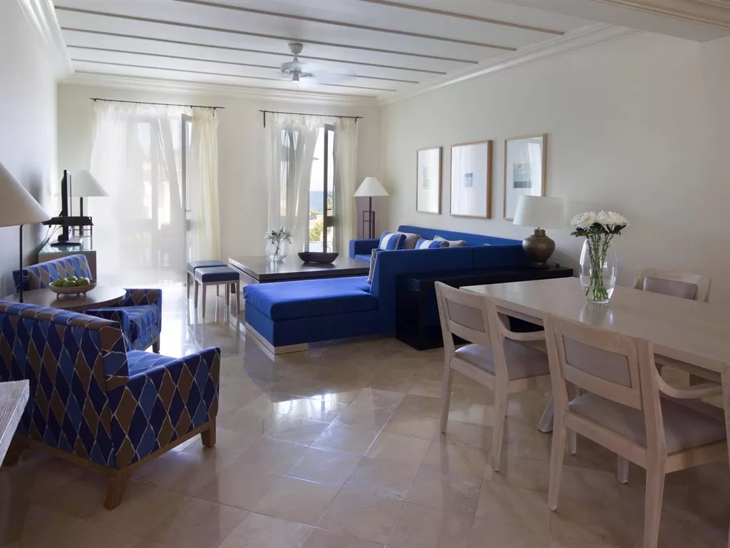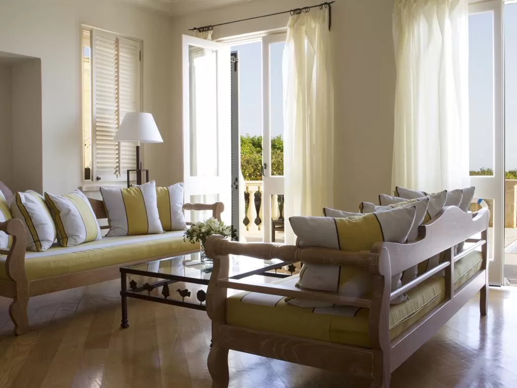 Suite Family 2 Brooms-Sea View. Сьют расположен в главном здании. Дизайн номера в средиземноморском стиле, мебель, изготовленная на заказ местными мастерами, 2 спальни, отдельная гостиная с ванной комнатой и терраса. Дополнительно: бутылка кипрского вина или другой местный алкогольный напиток, угощения от шеф-повара по прибытии, блюдо с фруктами (ежедневно).