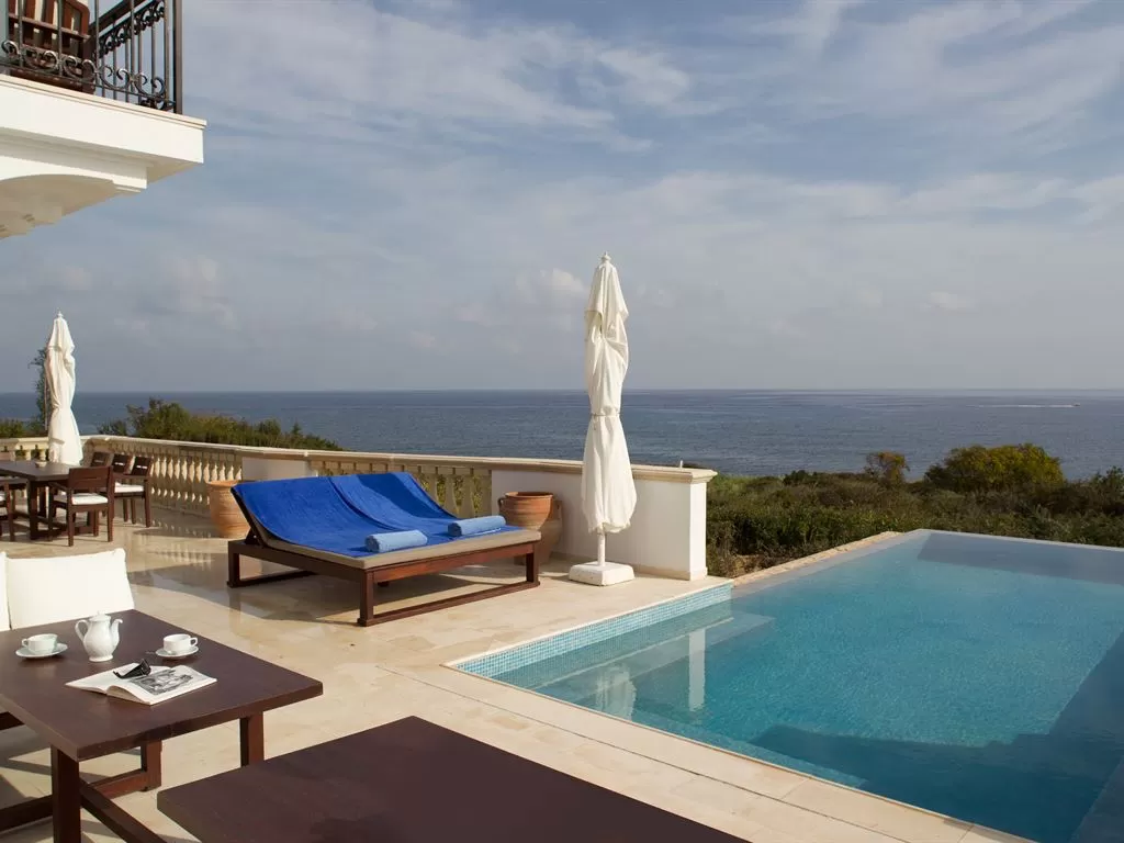 Suite 1 Broom Private Pool. Сьют расположен в главном здании. Дизайн номера в средиземноморском стиле, мебель, изготовленная на заказ местными мастерами, спальня, отдельная гостиная с ванной комнатой и терраса с бассейном (~12,8 кв.м; подогрев - по запросу). Дополнительно: бутылка кипрского вина или другой местный алкогольный напиток, угощения от шеф-повара по прибытии, блюдо с фруктами (ежедневно).