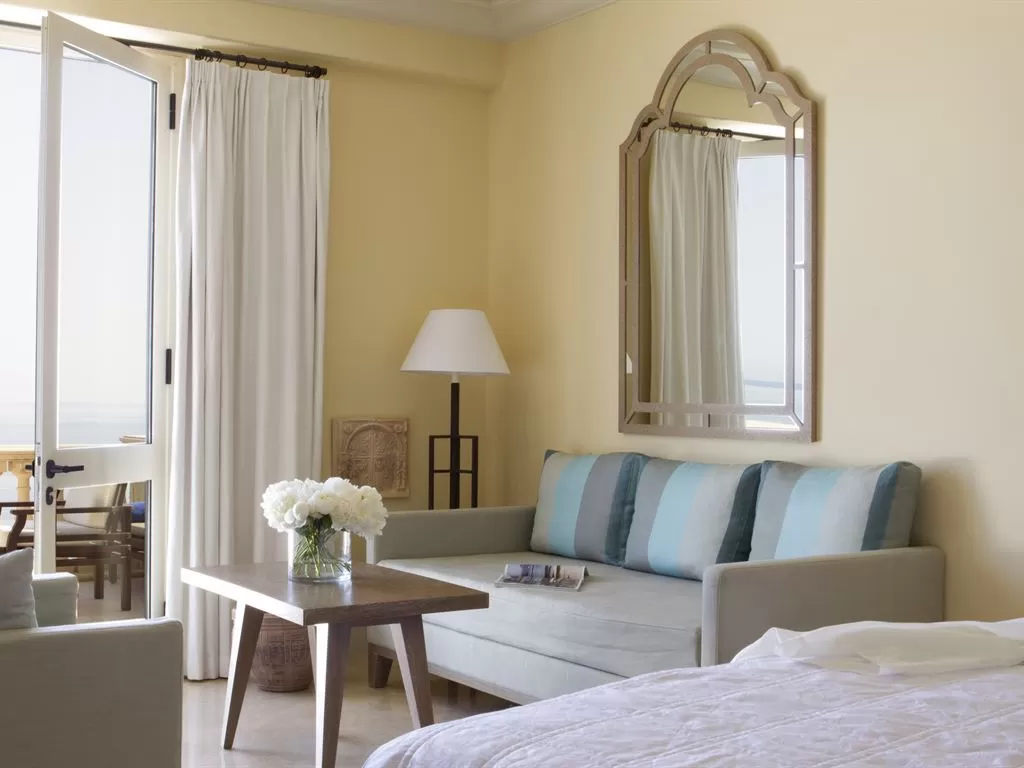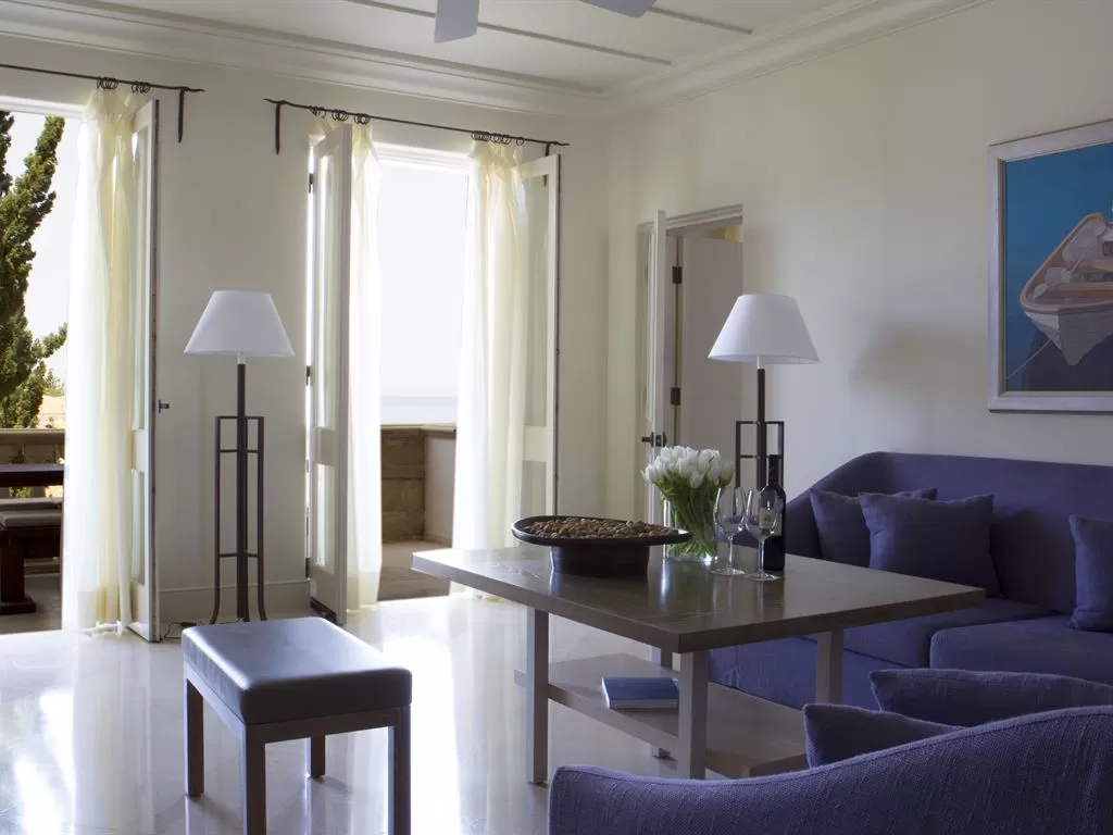 Junior Suite-Sea View. Сьют расположен в главном здании или в саду. Дизайн номера в средиземноморском стиле, вид на море, мебель, изготовленная местными мастерами, просторная гостиная зона, большая ванна для двоих. Дополнительно: угощения от шеф-повара.