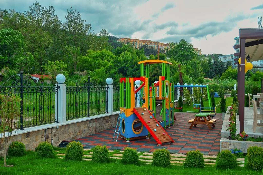 Детская кроватка, детская игровая площадка, детский бассейн, детские стульчики в ресторане.