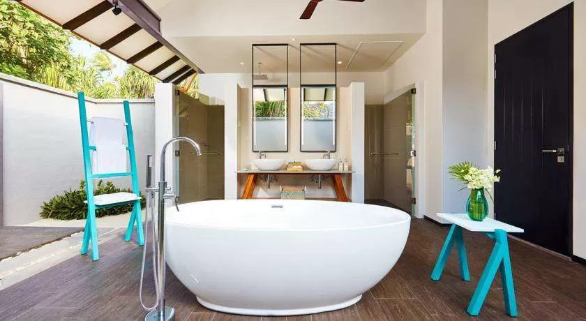 27 Beach Villa (95 м², макс. 3 или 2+1 чел.). Береговые виллы с видом на океан. Кровать king-size, тахта для отдыха. Ванная комната с ванной и двумя умывальниками, душ на открытом воздухе. Терраса со стульями / шезлонгами.