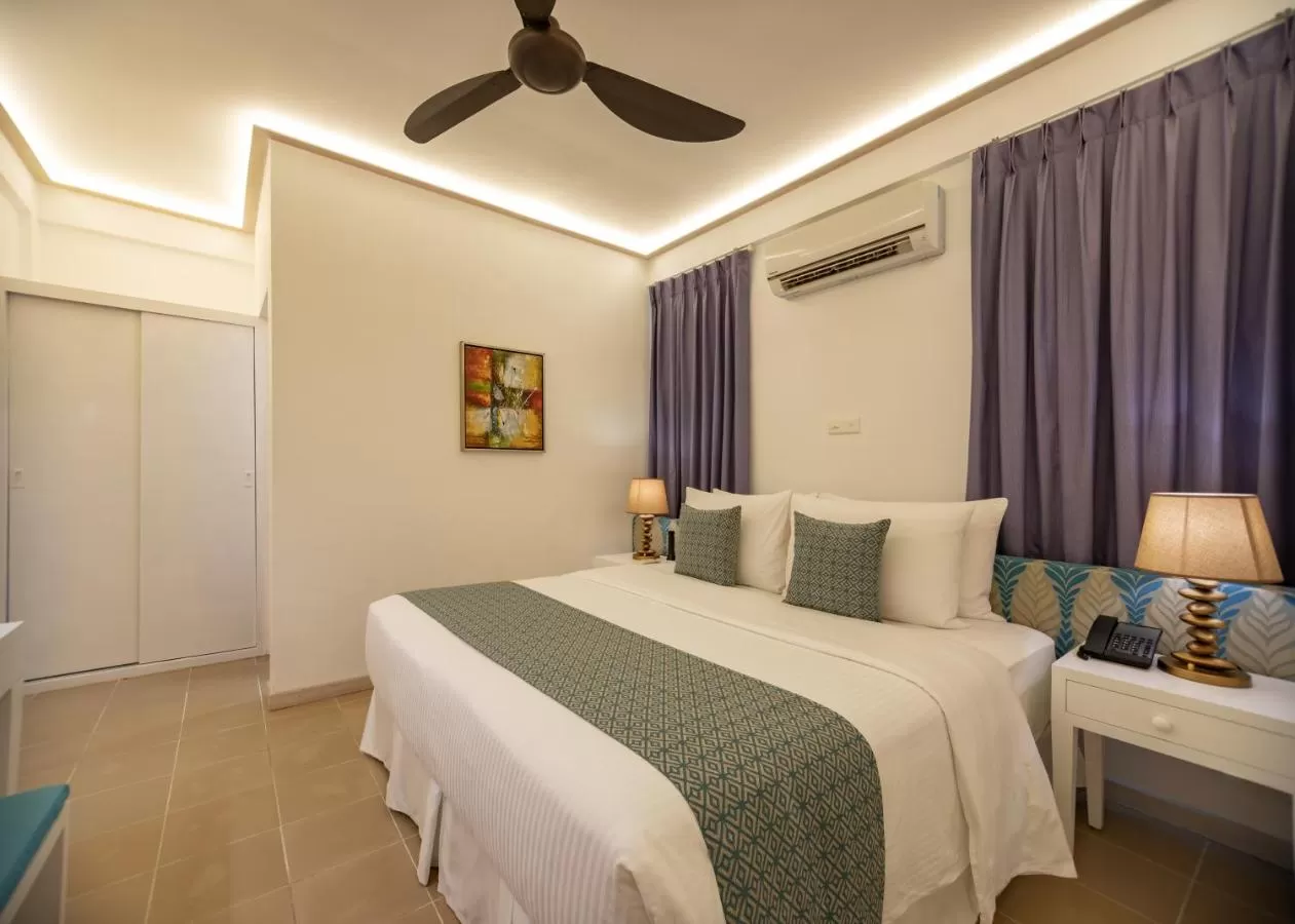 6 Garden Room (38 м², макс. 3 или 2 + 1 чел.). Расположены в блоке из 6 номеров, не имеют прямого доступа к морю и находятся на определенном удалении от береговой линии. Спальня с кроватью king size и небольшой зоной отдыха, ванная комната с душем.