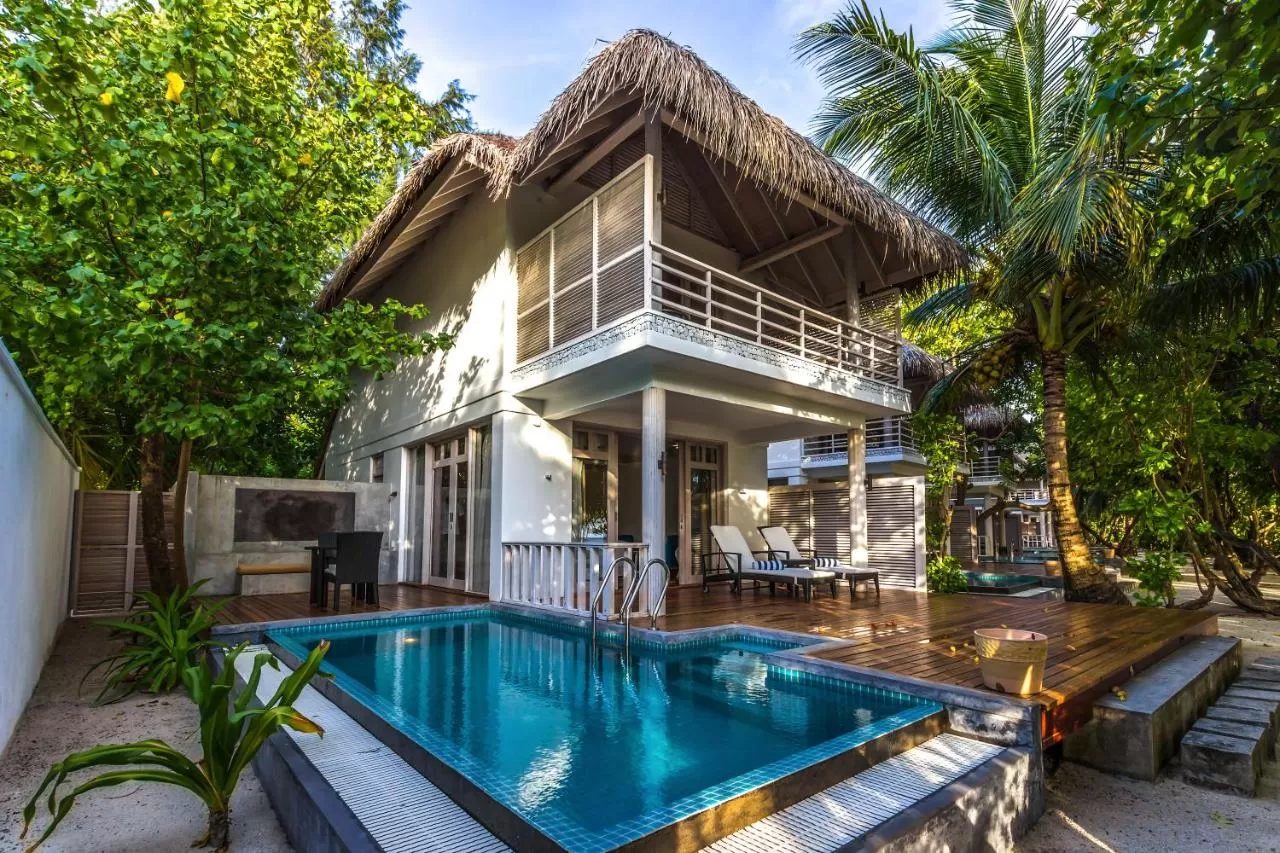 14 Beach Villa (90 м², макс. 3 или 2 + 1 чел.). Уютные береговые виллы с современным интерьером в светлых тонах. В номерах кровати super king - size, ванная комната с душем, ванна с функцией джакузи, на заднем дворике - небольшой бассейн, душ под открытым небом. Терраса с лежаками, обеденным столиком и стульями.