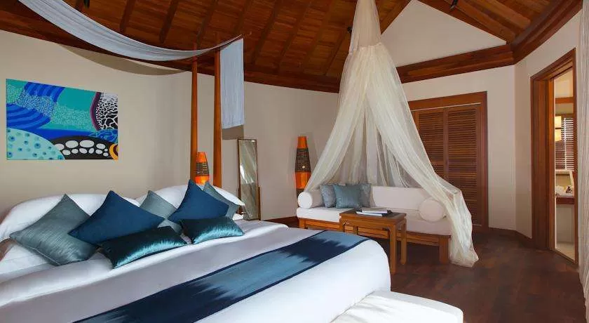 Sunrise over water suite (132 кв. м): терраса с обеденной зоной (стол на 2 персоны) на открытом воздухе, мини-столовая (стол на 2 персоны), спальня с кроватью king-size, ванная комната с ванной и отдельным душем, душ на открытом воздухе. Расположены на сваях над водой. Спуск в лагуну. Вид на океан и восход солнца.