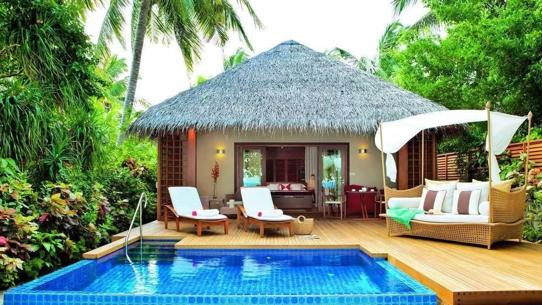 1 Baros Residence with Private Pool (268 м2, макс. 3 или 2+1 чел.). Уединенная отдельно стоящая просторная вилла на берегу, окруженная тропической зеленью: спальня с кроватью king-size, зона гостиной, частный бассейн (7x3 м), частный садик, ванна и душ в ванной комнате, ливневый душ под открытым небом, просторная веранда с тахтой для отдыха, небольшая коллекция книг и дисков.