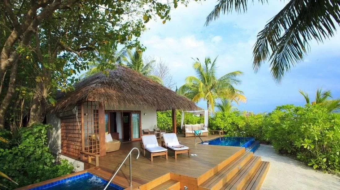 2 Baros Premium Pool Villa (160 м2, макс. 3 или 2+1 чел.). Отдельно стоящие просторные виллы на берегу: спальня с кроватью king-size, небольшой частный бассейн-каскад (3,4x2,4 м) и джакузи для двоих (1,7х1,7 м), собственный участок пляжа с шезлонгами, большая открытая деревянная терраса с тахтой для двоих и обеденным столом.
