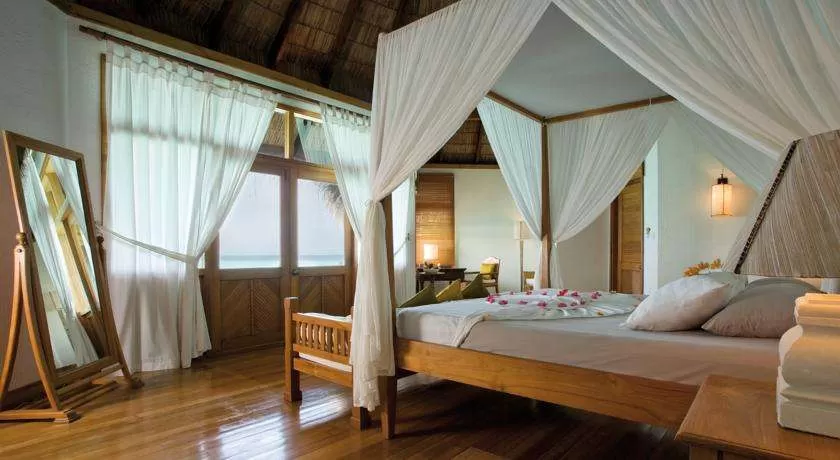 12 Lagoon Villa (87 м², макс. 3+1 или 2+2 чел.). Отдельно стоящие виллы на сваях в лагуне с гостиной зоной, просторной спальней с кроватью king-size с балдахином, письменным столом, ванной комнатой с джакузи с видом на океан и небольшим бассейном на террасе. Изысканная обстановка с элементами декора в мальдивском стиле. Прямой спуск в воду. Интернет Wi-Fi бесплатно.