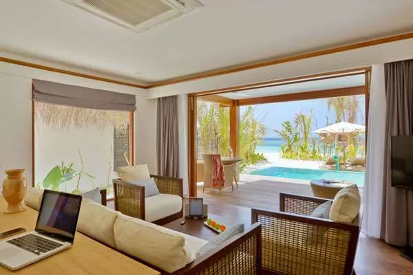 8 Duplex Pool Villa (150 кв. м) двухэтажные виллы на пляже в западной части острова. На первом этаже находятся гостиная, гардеробная, ванная комната с ванной, душем, двумя раковинами и душем на открытом воздухе. На веранде – зона отдыха, обеденная зона и собственный бассейн площадью 18 кв.м. На втором этаже находится просторная спальня с кроватью king size, вторая ванная комната и балкон с диванчиком и креслами, откуда открывается прекрасный вид на океан.