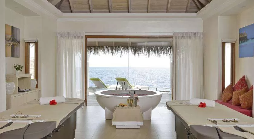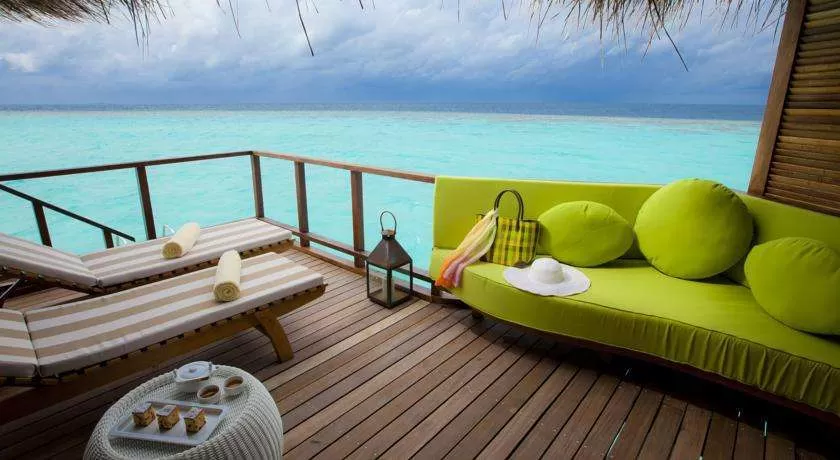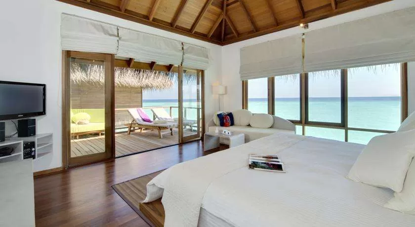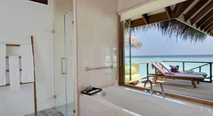 22 Water Villa (100 м2, макс. 3 или 2+1 чел.). Отдельно стоящие надводные виллы. Терраса с лежаками и прямым спуском в воду. Ванна и ливневый душ в ванной комнате с видом на океан.