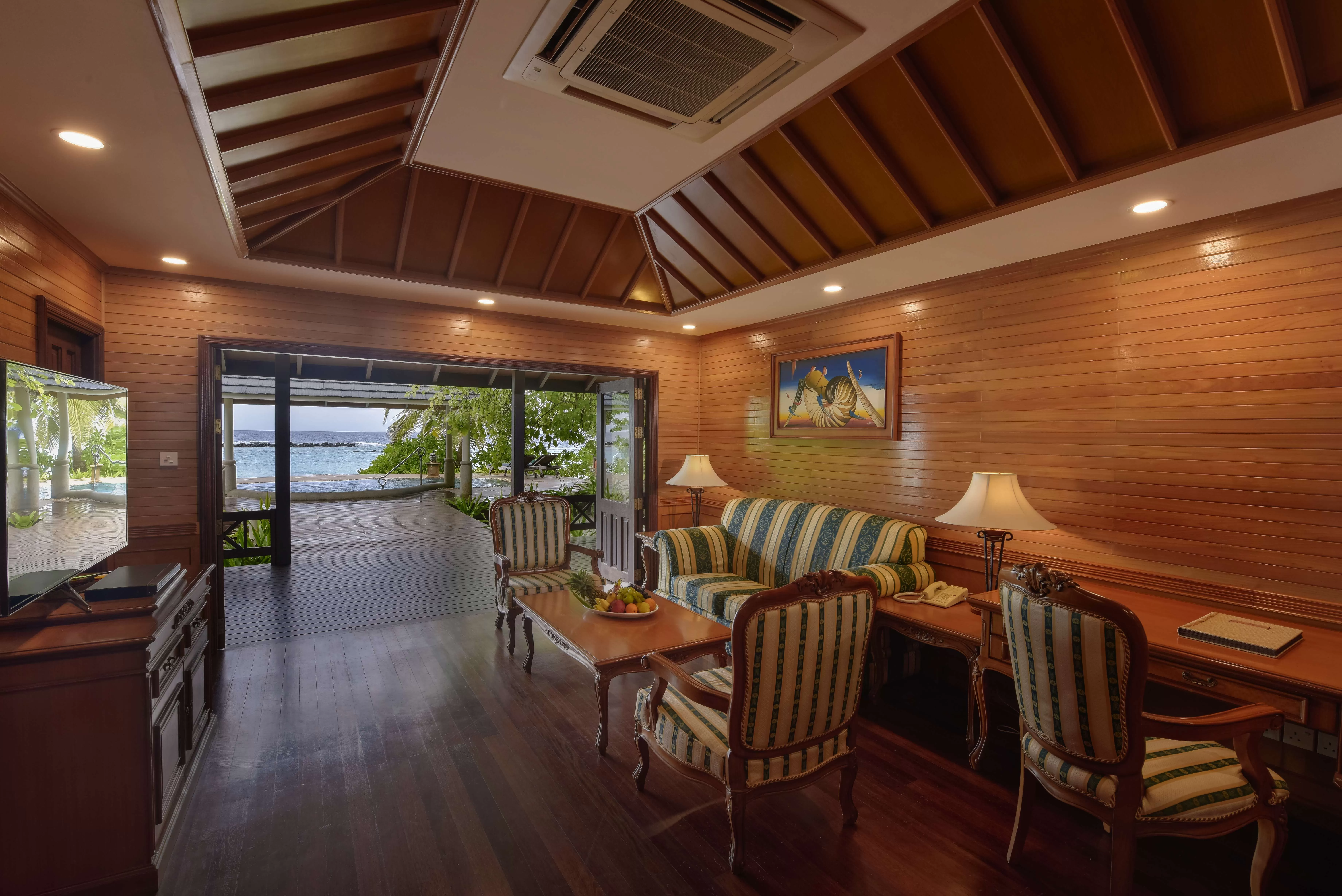 2 Presidential Suite (246 м2, макс. 4 или 4+2 чел.). Одноэтажные береговые бунгало: 2 спальни и гостиная, две ванные комнаты с джакузи, собственный бассейн, джакузи, веранда, обеденная зона. Отделка номера выполнена из редкого дерева мерабу.