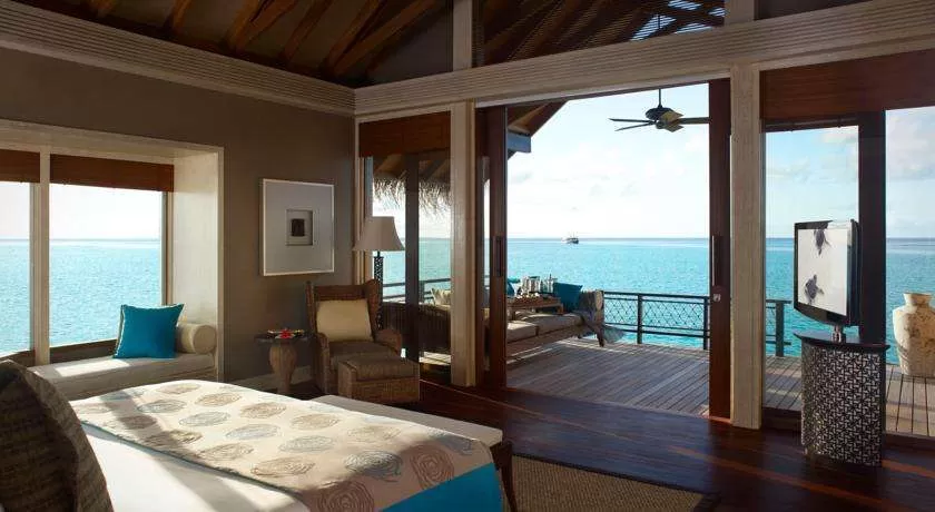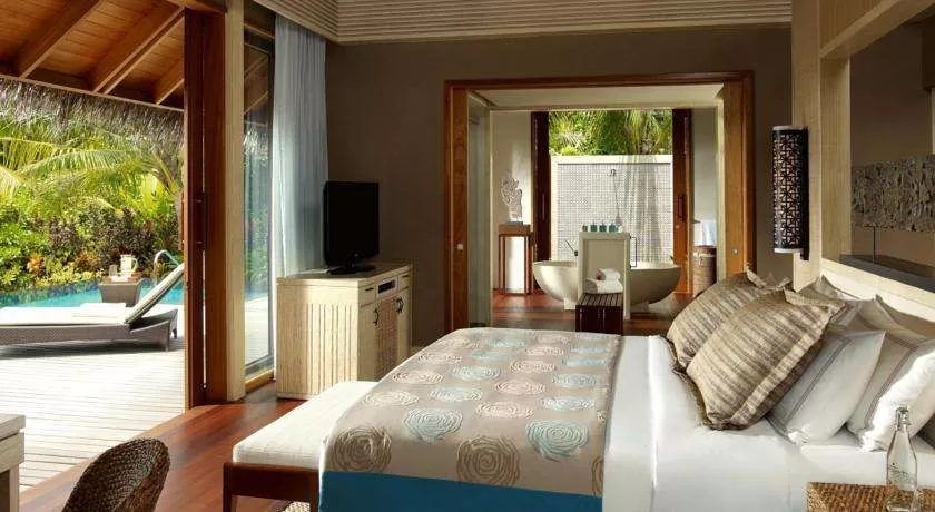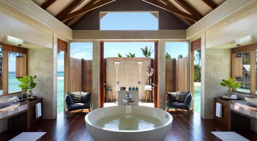 60 Water Villa (166 м², внутренние помещения 94 м², макс. 3 или 2+2 чел.). Водные виллы с большой приватной двухуровневой террасой и спуском в воду. Ванная комната с ванной овальной формы, 2 душа (в помещении и на открытом воздухе).