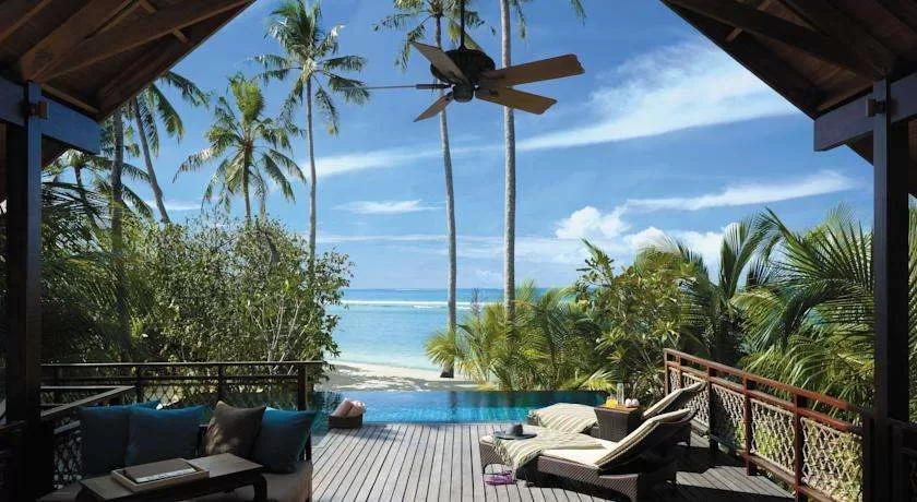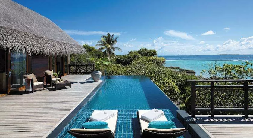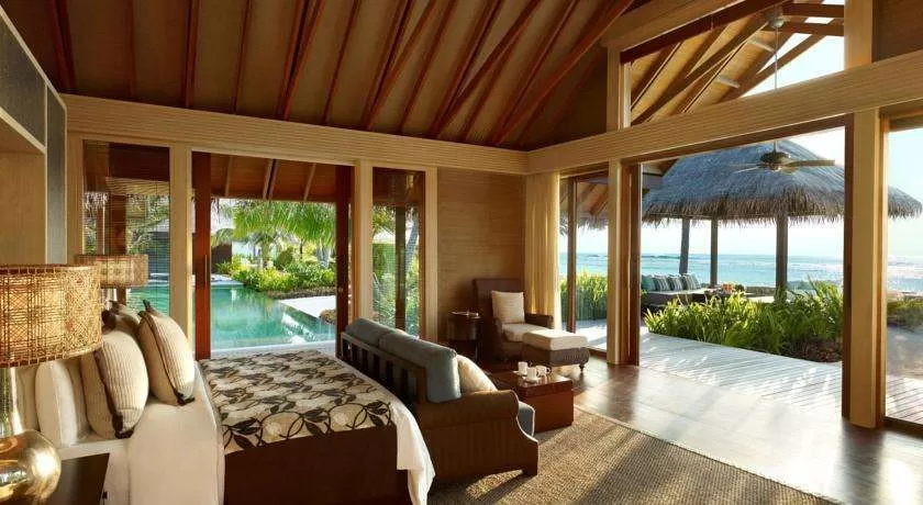 8 Ocean View Villa (218 м2, внутренние помещения 87 м², макс. 3 или 2+2 чел.). Виллы на сваях, поднятые на 3 метра над землей, с видом на океан. Бассейн на террасе с шезлонгами. Спальня, ванная комната с ванной овальной формы, 2 душа (в помещении и на открытом воздухе). Гостиная на открытом воздухе. Дизайн в восточно-индийском стиле элегантно сочетает как традиционные, так и современные элементы интерьера.