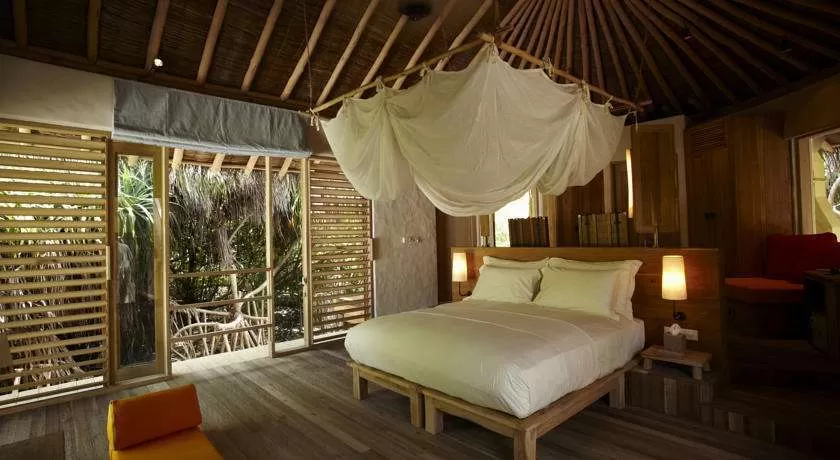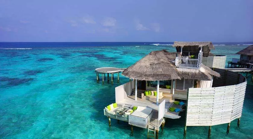 18 Laamu Water Villa (108 м², макс. 3 или 2+2 чел.). Водные виллы, расположенные в самом конце ряда водных вилл, в наибольшем удалении от берега, с видом на океан. Ванная комната со стеклянной ванной с видом на океан, частный водный садик. Обеденная терраса с прозрачным столом, зона отдыха на открытом воздухе с шезлонгами, тахтой и надводным гамаком, обеденная зона на верхней террасе и обзорная площадка с тахтой для отдыха. Дополнительно: бутылка шампанского в день заезда, iPod в номере, выбор закусок (бесплатно), гамак с удобными подушками, кофемашина Nespresso, индивидуальные бирки для велосипедов, бесплатный завтрак в номере (заказывается по меню In Villa Dining).