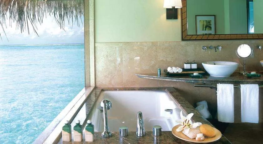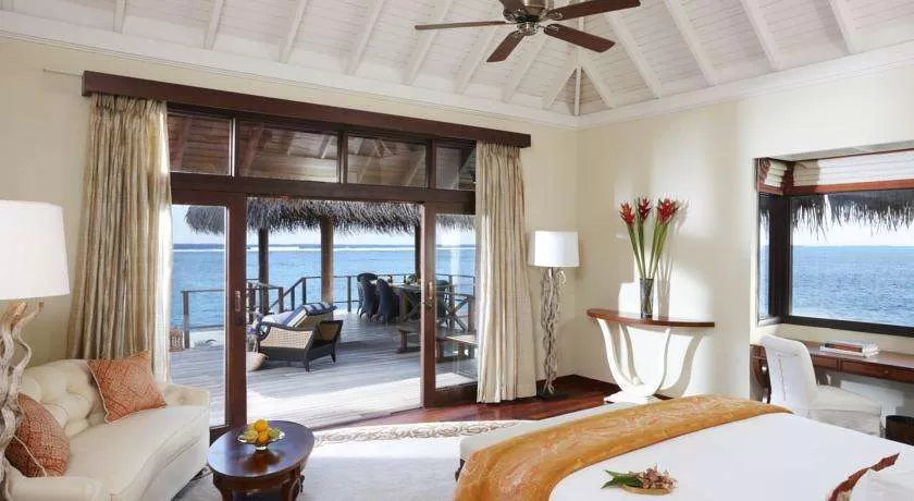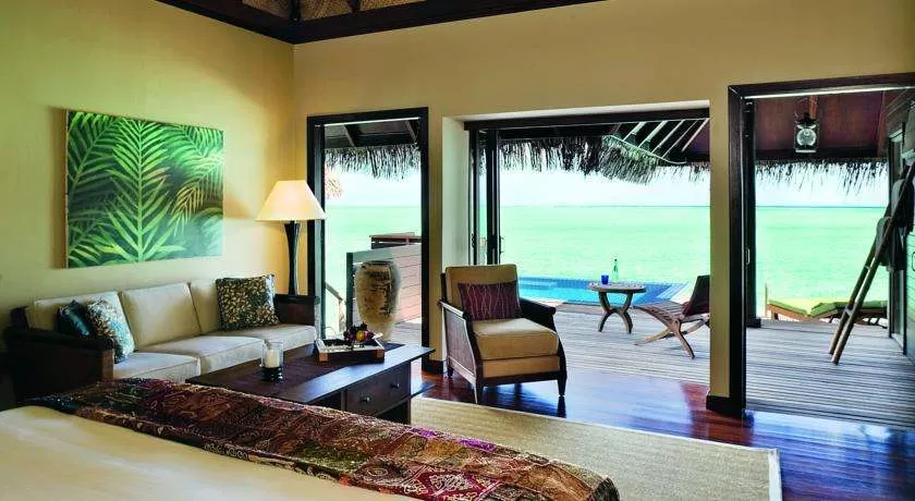 2 Ocean Suite (195 м2, макс. 3 или 2+2 чел.). Роскошная надводная вилла с изысканным дизайном интерьера. Гостиная, спальня, мини-кухня, ванная комната с видом на океан, душ на открытом воздухе, обеденная беседка, частный бассейн, приватная веранда с шезлонгами. Терраса, заполненная белым песком.