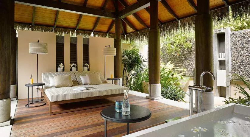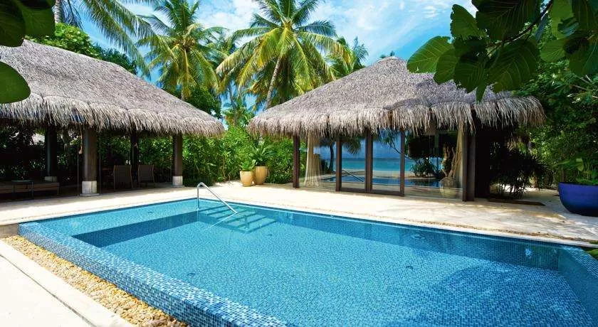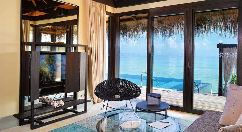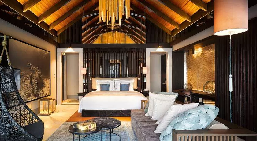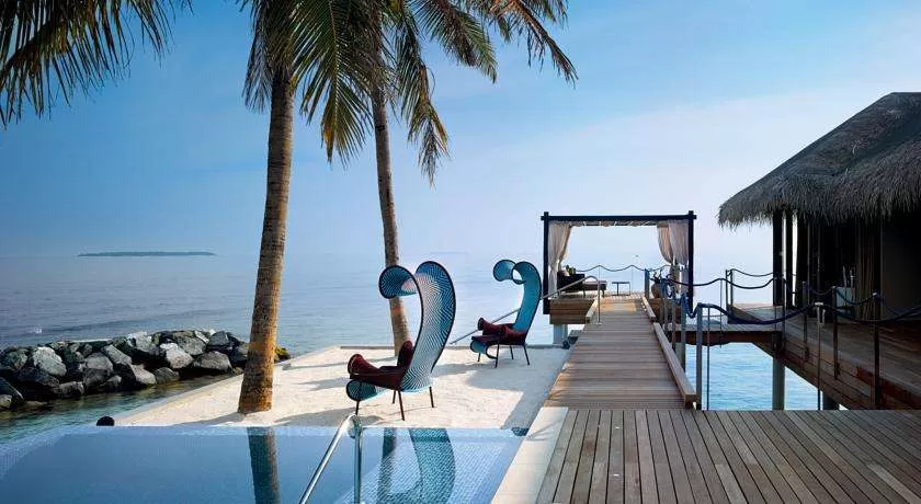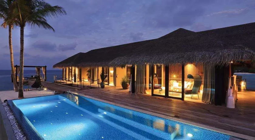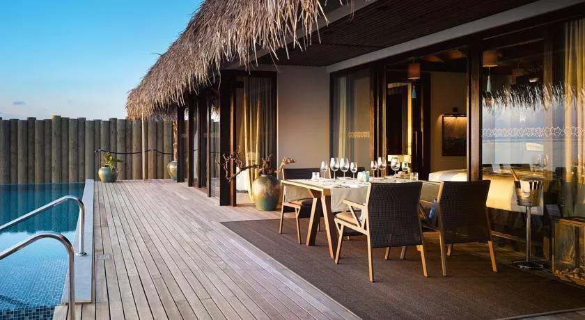 1 Romantic Pool Residence (623 м2 (внутренние помещения – 197 м2; на открытом воздухе – 337 м2); макс. 3 или 2+1 чел.). Уединенная водная вилла, не соединенная с островом причалом (добраться можно только на лодке). Спальня, гостиная, обеденная зона, тренажерный зал, комната для проведения SPA-процедур. Ванная комната с круглой ванной (в помещении) и ванна на открытом воздухе. Все комнаты имеют выход на террасу с частным бассейном (89 м2), зоной отдыха, надводной обеденной беседкой.