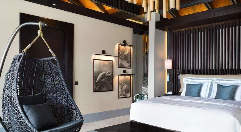 9 Beach Pool Villa (295 м2 (внутренние помещения – 80 м2; на открытом воздухе – 179 м2); макс. 3 или 2+1 чел.). Отдельно стоящие береговые виллы с частным бассейном (36 м2). Спальня и зона гостиной (не разделены дверью или перегородкой), мебель из тикового дерева. Ванная комната разделена на 2 зоны: в помещении (душ, 2 раковины) и частично на открытом воздухе (крытая беседка с большой ванной, шезлонги). Терраса с обеденной зоной и зоной отдыха.