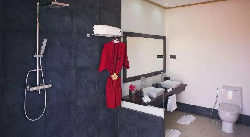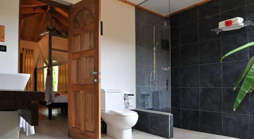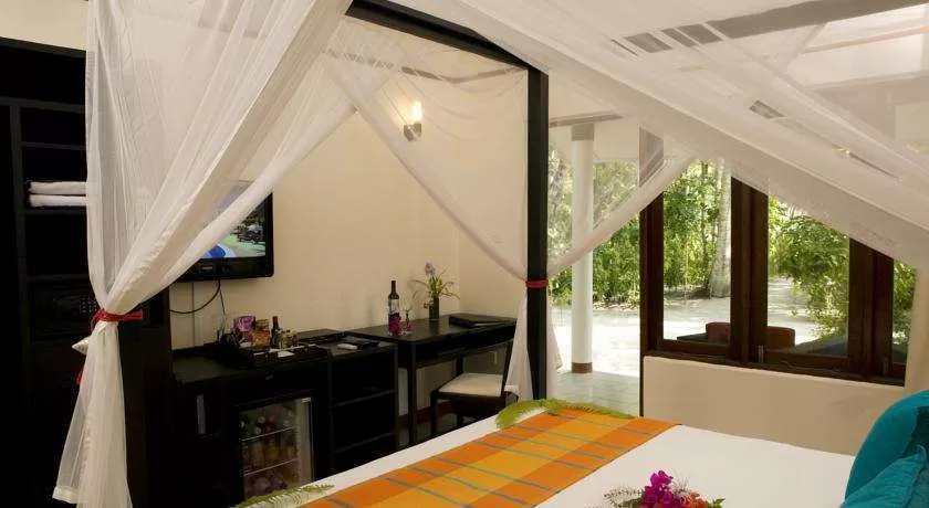 13 Garden Room (55 м2, макс. 2+1 чел.). Cгруппированы в блоки по 4 или 5 номеров, расположены в удалении от пляжа, кровать с балдахином, пол – плитка, ванная комната с душем.