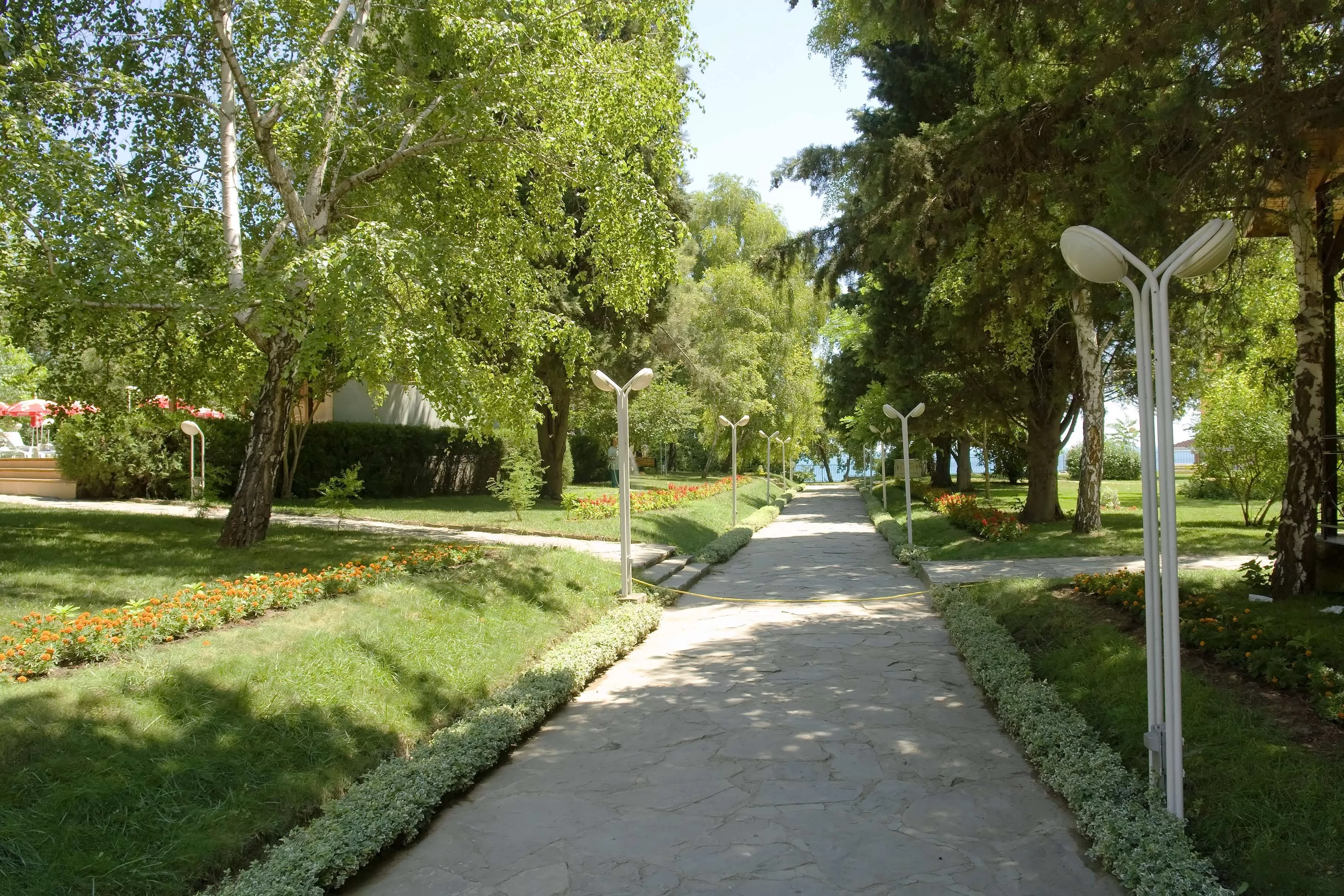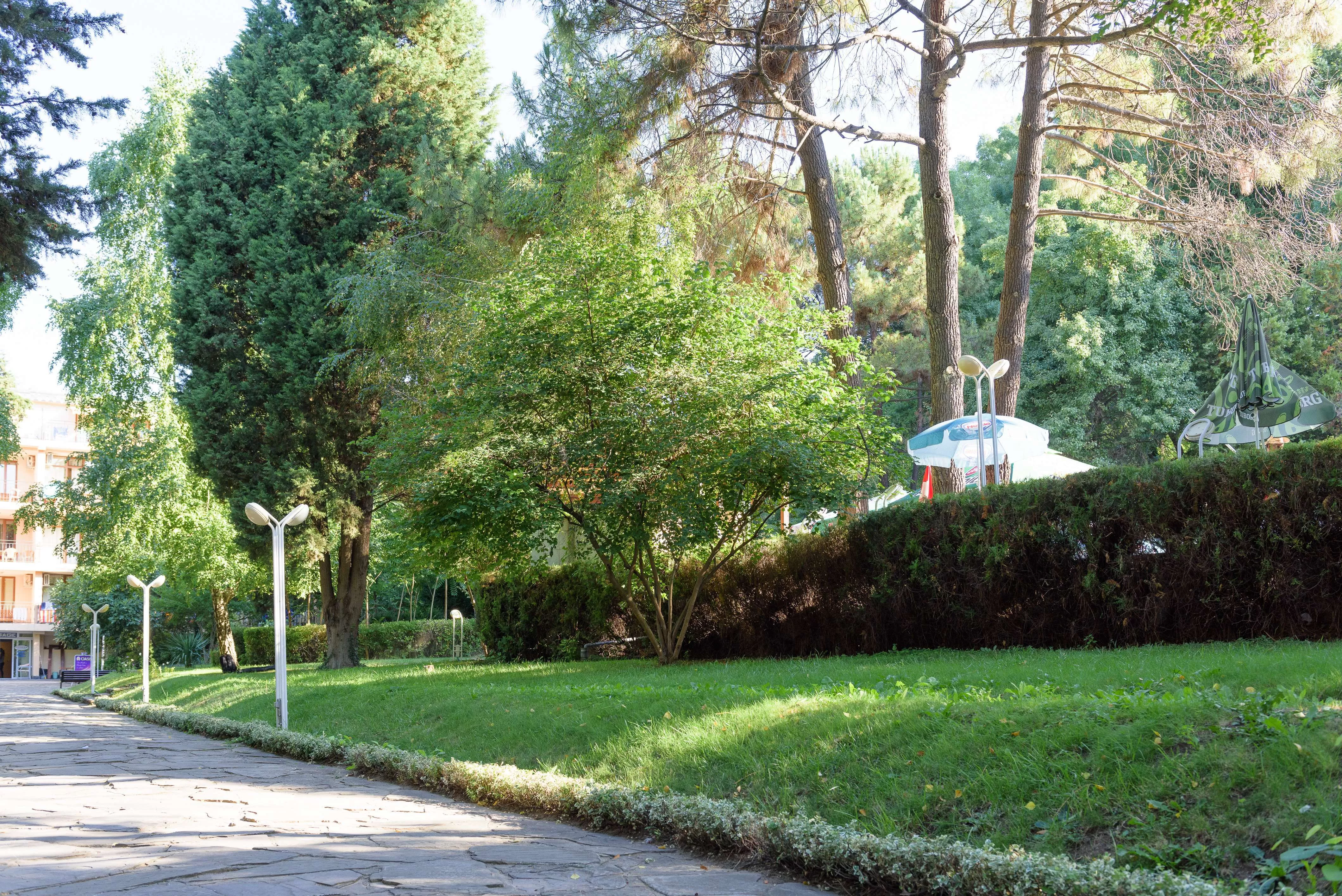 Отель Oasis располагает большим парком площадью 11.200 м2 с прямым выходом на пляж и видом на пляж, окруженным большим количеством зелени и различных цветов.
