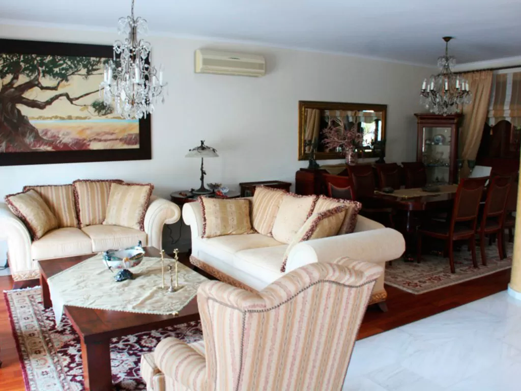 Первый этаж (Ground Floor) с гостиной открытой планировки, столовая, оборудованнаня кухня (электрическая плита, холодильник, микроволновка, посудомоечная машина, посуда), кладовка, ванная комната, телевизор, сейф, камин. Современный дизайн, 2 больших балкона с видом на море, сад с цветами и пальмами, плавательный бассейн с пресной водой (70 кв.м.; 1,40х2,50), лежаки и зонты.