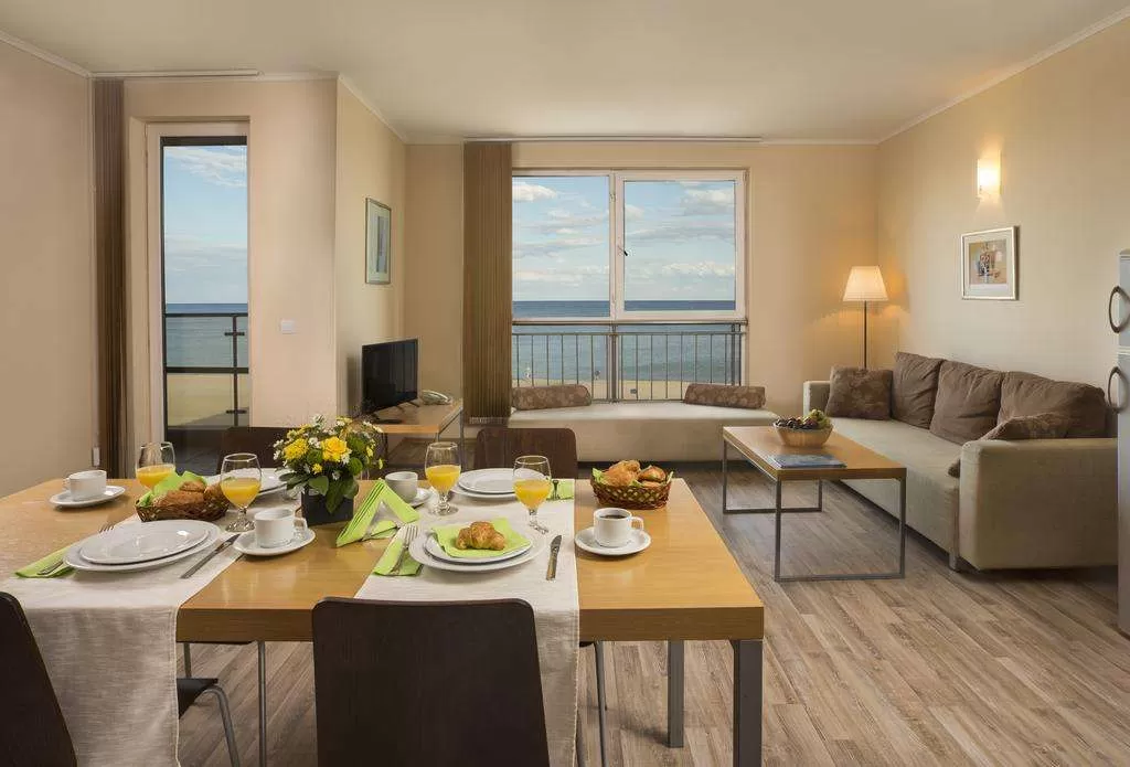 All Inclusive Light - шведский стол. Завтрак: 07.30 - 10.00, обед: 12.30 - 14.00, обед: 18.00 - 21.00. Полдник с 15.30 до 17.00 - кофе, вода, безалкогольные напитки, сладости, пицца, круассаны, фрукты. Напитки вне время питания предлагаются с 10:30ч. до 21:30ч. на баре в ресторанe Castello: соки и вода с автомата, болгарское разливное пиво и вино.