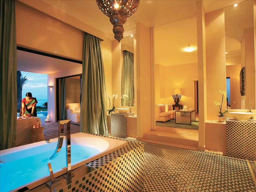 тканями). Роскошная ванная комната (декоративный камин, джакузи, ванна с арома-