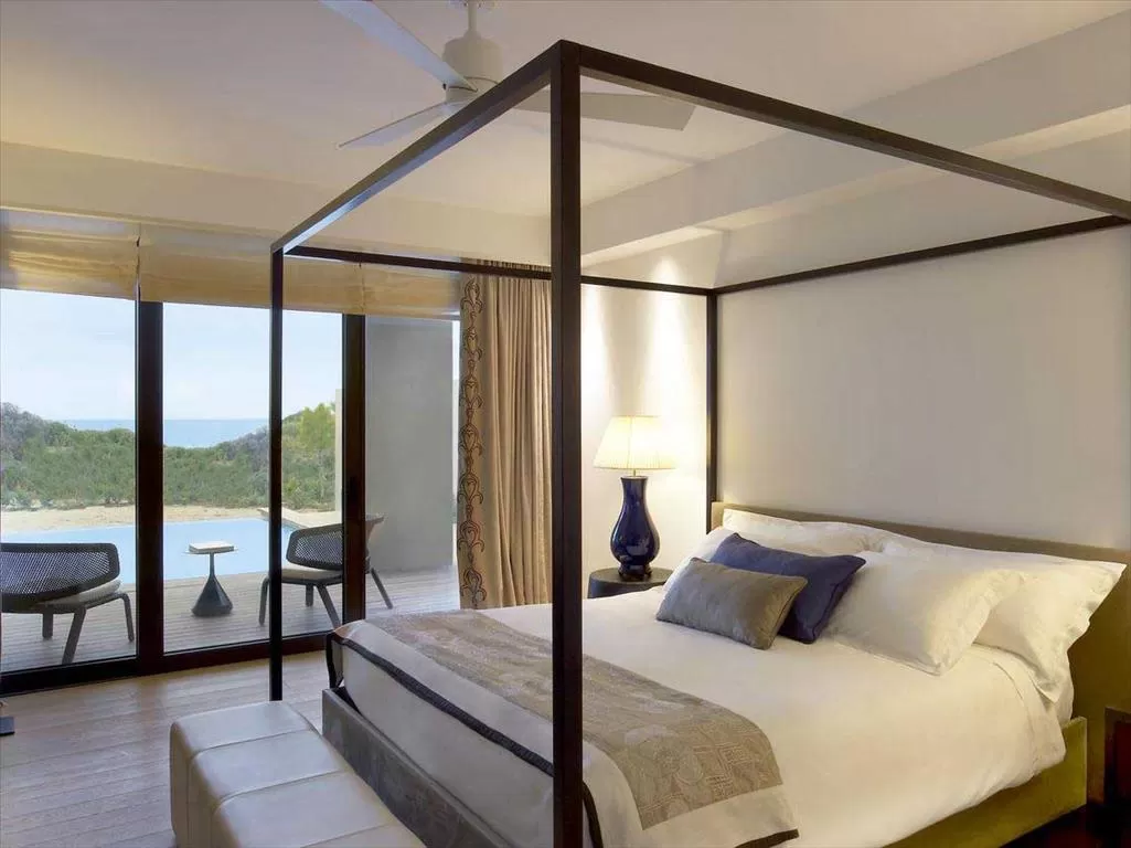 Виллы Ithomi и Sapienza (по 192 кв.м) Выход к морю. Собственные пейзажные песчаные зоны с переливными бассейнами (70 кв.м). 2 спальни, гостиная, просторная зона для отдыха, обеденная зона с совр. мебелью, полы из древесины твердых пород, домашний кинотеатр. Из всех комнат - выход на огромную террасу с шезлонгами, небольшая кухня. В основной спальне: эксклюзивная «королевская» кровать Luxury Collection. 2-ая спальня: 2 односпальные кровати. В каждой ванной комнате: туалетный столик, отдельная ванна, тропический душ, незапотевающие косметические зеркала. Круглосуточная служба дворецкого.