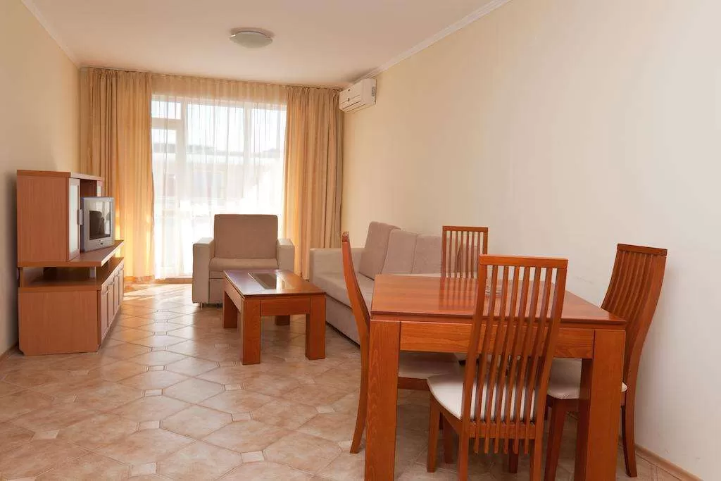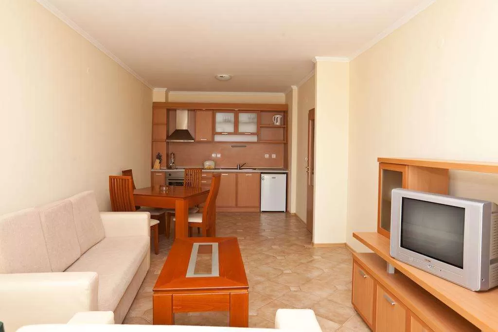 Apart 1Br - спальня с двумя односпальными кроватями, гостиная с раскладным диваном, кухонный уголок с плитой, вытяжкой, мойкой, холодильником и набором бытовой посуды. Есть смежная дверь.