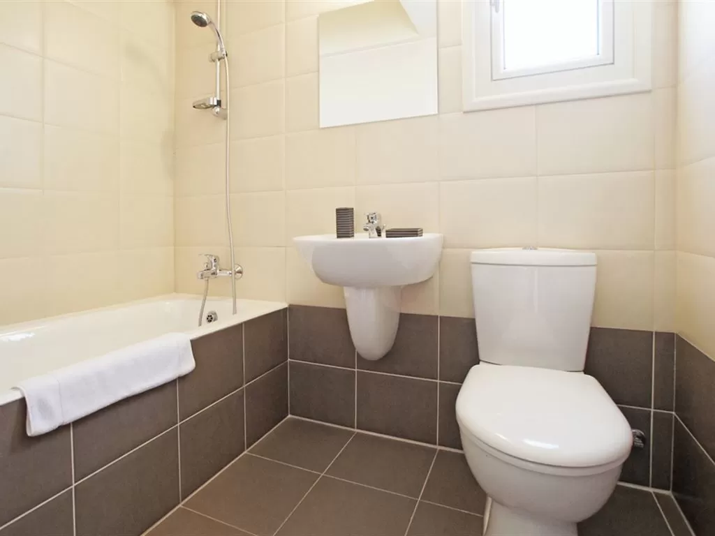 На верхнем этаже: 3 спальни и ванная комната. 2 двуспальные кровати и 2 односпальные Или двуспальная кровать и 4 односпальные.