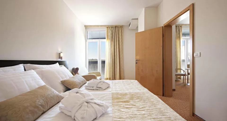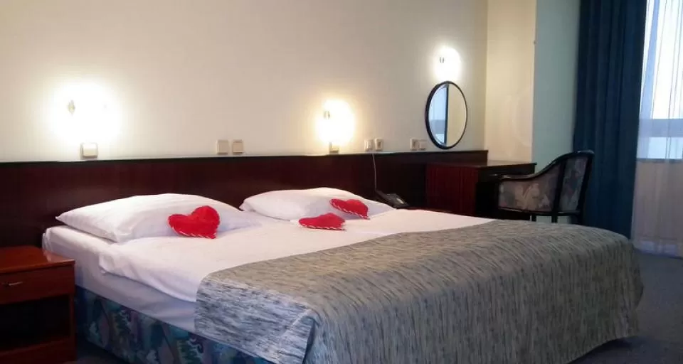 Номера «джуниор сьют»: двухкомнатный номер с небольшой гостиной и спальней. В номере: телефон, русские каналы ТВ, сейф, мини-бар, халат, ванная комната (ванна/душ, туалет, фен), один вход.