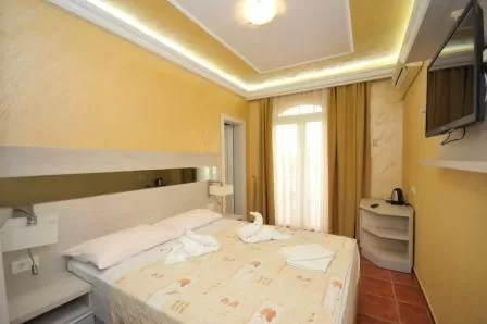 В номерах: кондиционер, кабельное ТВ, телефон, ванная комната с ванной или душем, балкон, сейф. Часть номеров с видом на море. DBL STD:18м2, балкон 5 м2, французская кровать.