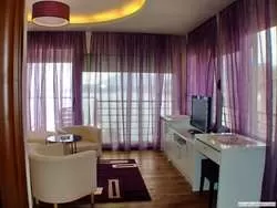 В апартаментах: гостиная с гарнитуром кожаной мебели (диван раскладывается), отдельная спальня, 2 ванных комнаты (отдельно для гостиной и спальни): в одной – душ, в другой – душ, джакузи и биде; терраса с видом на море, лежаками, столом и стульями, LCD телевизоры, сейф, минибар, душ, халаты, тапочки.