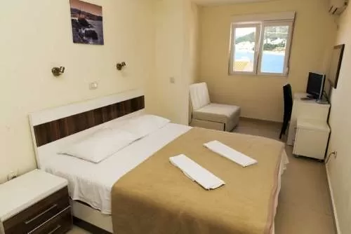 STUDIO Large SV: около 30м2+ терраса 5м2 с видом на море, французская кровать и раскладной диван, душ. Полы – керамическая плитка. APART 2 Bedroom: около 60м2+ 2 террасы: 6м2 с видом на море и 4м2 (без вида на море); гостиная: диван + раскладное кресло(или 2 раскладных кресла), две спальни: одна с французской кроватью, другая – с двумя раздельными кроватями (или обе спальни с французскими кроватями); душ или ванная. APART 1 Bedroom: около 40м2+терраса с видом на море, гостиная: диван + раскладное кресло, кухня, спальня: французская кровать; ванная комната с феном.