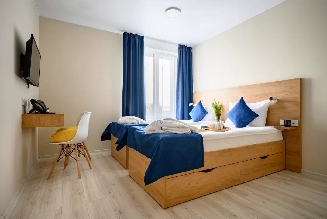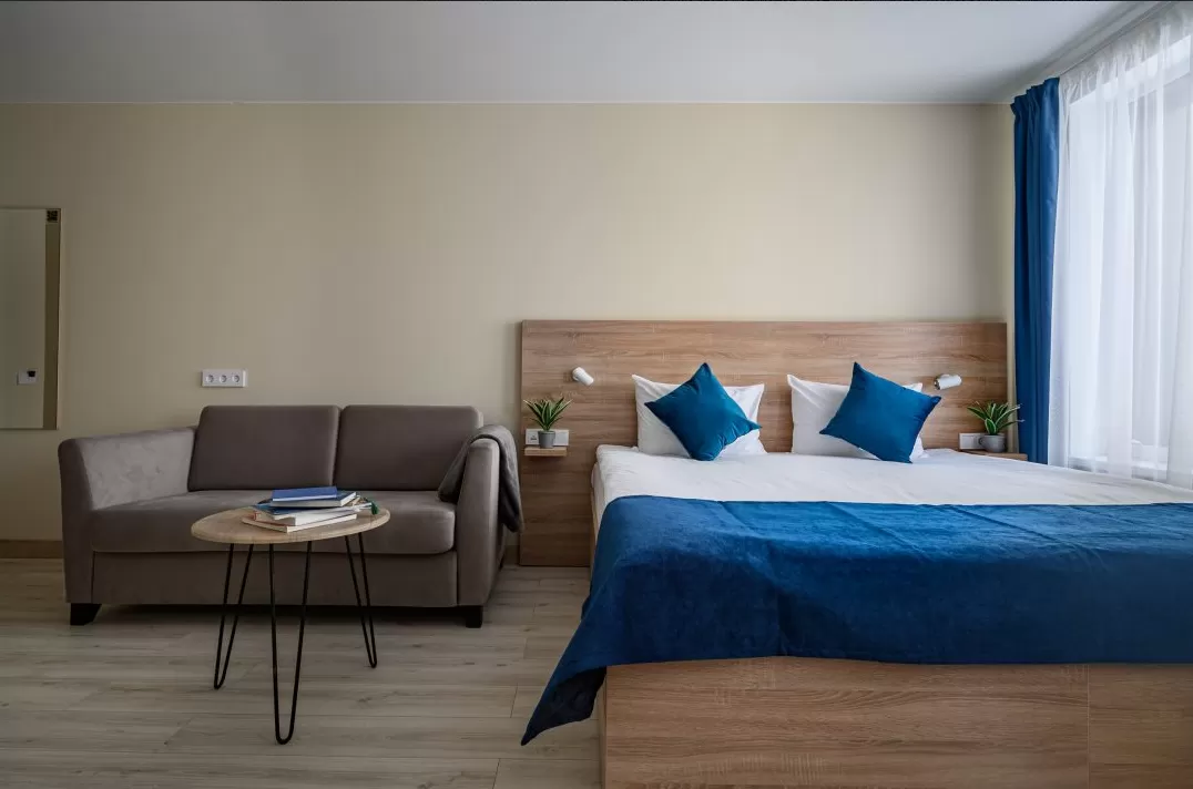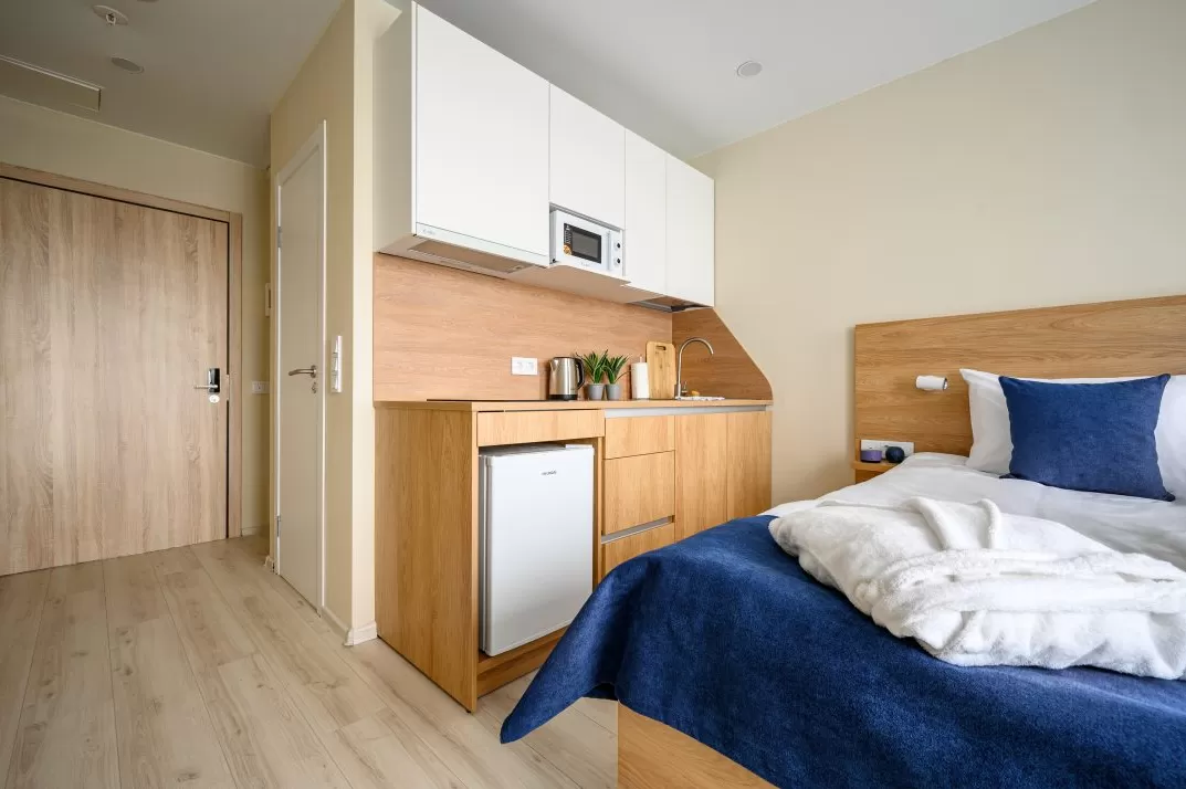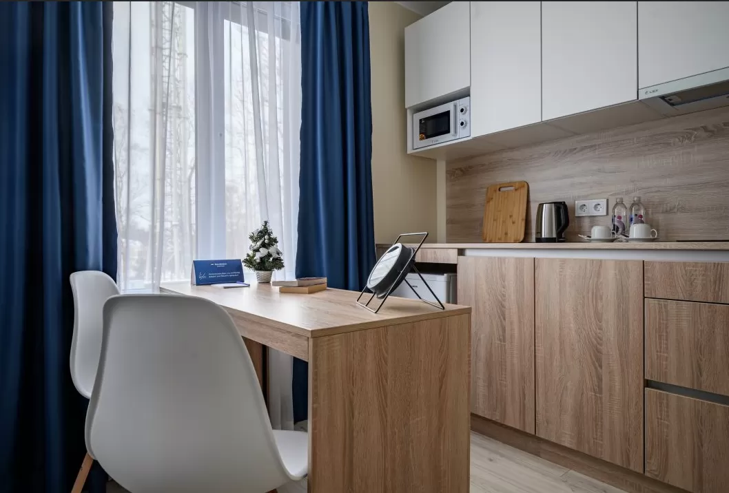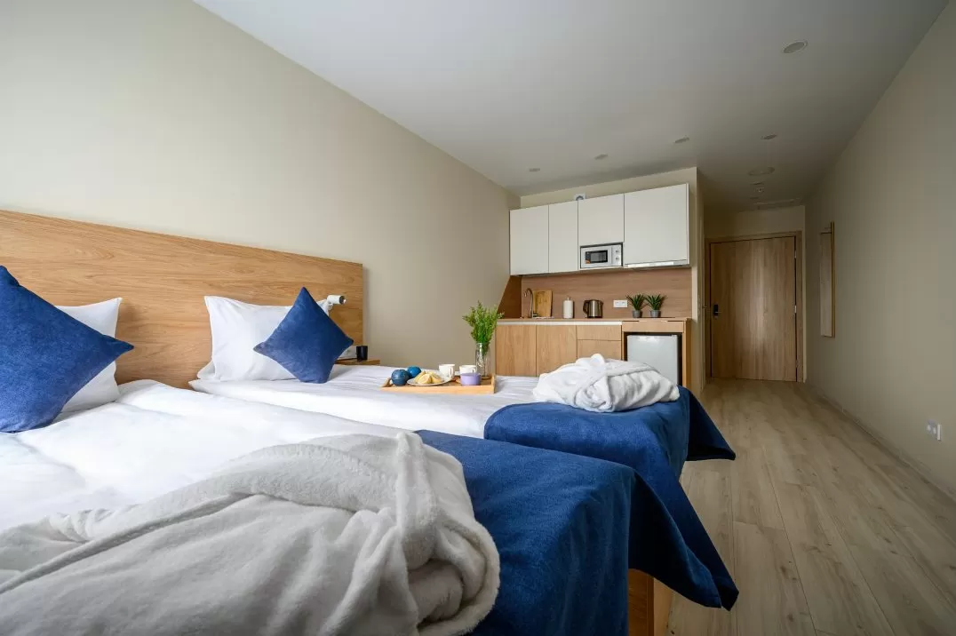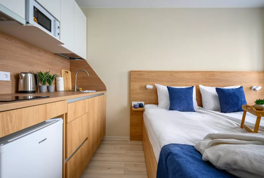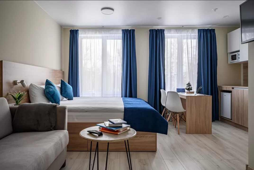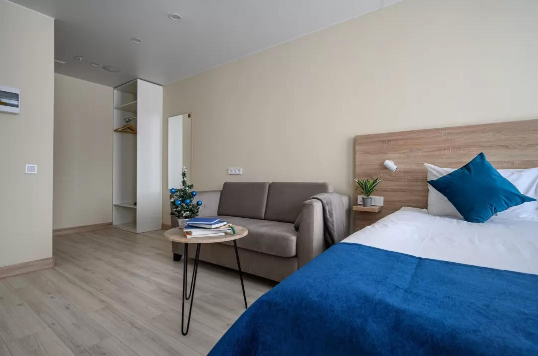 Номерной фонд включает в себя апартаменты категорий «Стандарт» площадью 18 м2. Гостям предлагается отдохнуть в светлых номерах с современной мебелью, где для комфортного проживания есть бесплатный Wi-Fi, ЖК-телевизор и собственная ванная комната. Кухонная зона отлично подойдёт для самостоятельного приготовления блюд, так как там имеется варочная панель, холодильник, электрочайник, СВЧ-печь и необходимая посуда.