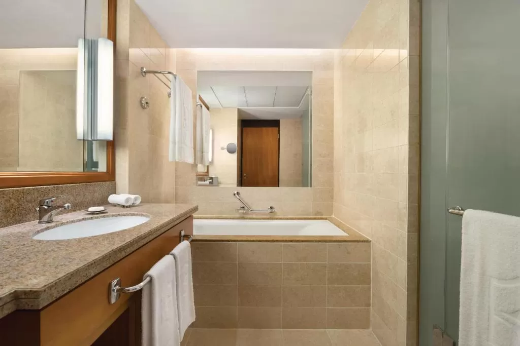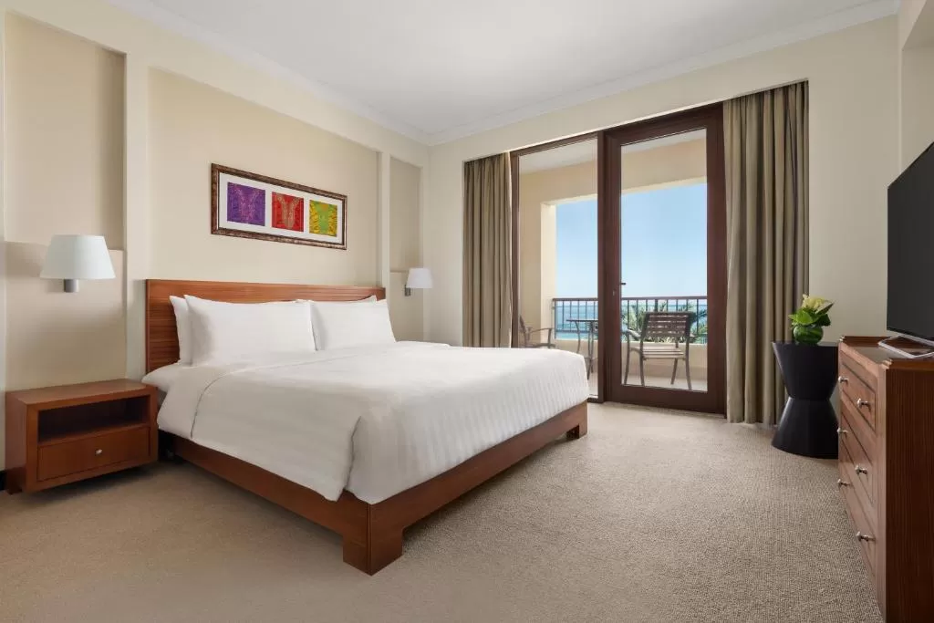 Номера оформлены в современном стиле с элементами арабского декора. В каждом есть кондиционер, телевизор, мини-бар, рабочая зона и балкон с видом на море или горы.