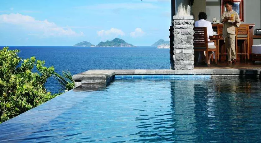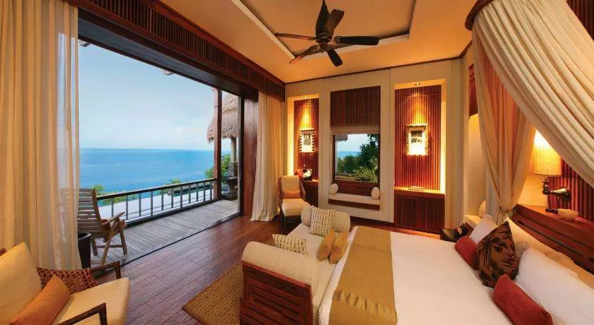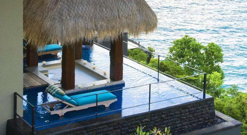 Ocean panoramic villa (250 кв. м): терраса с открытым персональным бассейном, беседка, мини-кухня, спальня с гостиной зоной, ванная комната с ванной и душевой кабиной. Расположены на холме или рядом с пляжем. Прямой выход на пляж (в некоторых виллах). Панорамный вид на океан и сады.