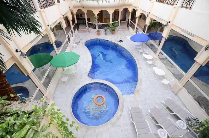 Крытый бассейн, у бассейна шезлонги, полотенца (бесплатно), магазины.