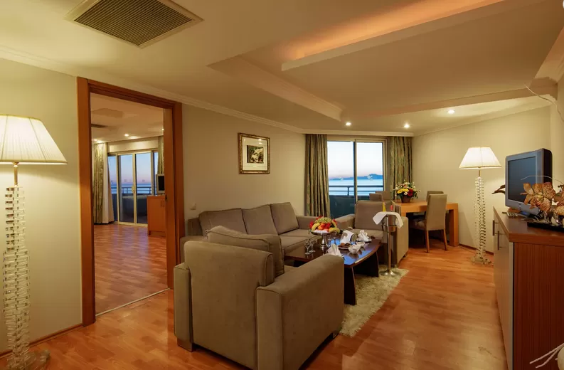 JuniorSuites (50 м2): спальня с french кроватью и гостиная с мягкой мебелью с разделительной дверью, оснащение стандартного номера.