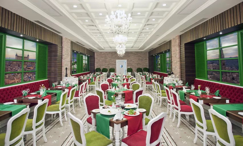 В ресторанах и барах: завтрак, поздний завтрак, обед и ужин - шведский стол, холодные и горячие закуски днем, диетическое меню, чаепитие, кофе, выпечка, гёзлеме, ночные закуски, ужин в ресторанах A'la Carte – 1 посещение одного из ресторанов за период проживания, алкогольные и безалкогольные напитки местного производства 24 часа и некоторые импортного производства с 10:00 до 01:00, сервис в номер с 02:00-06:00.