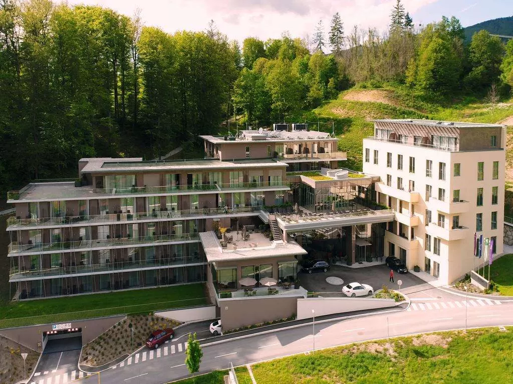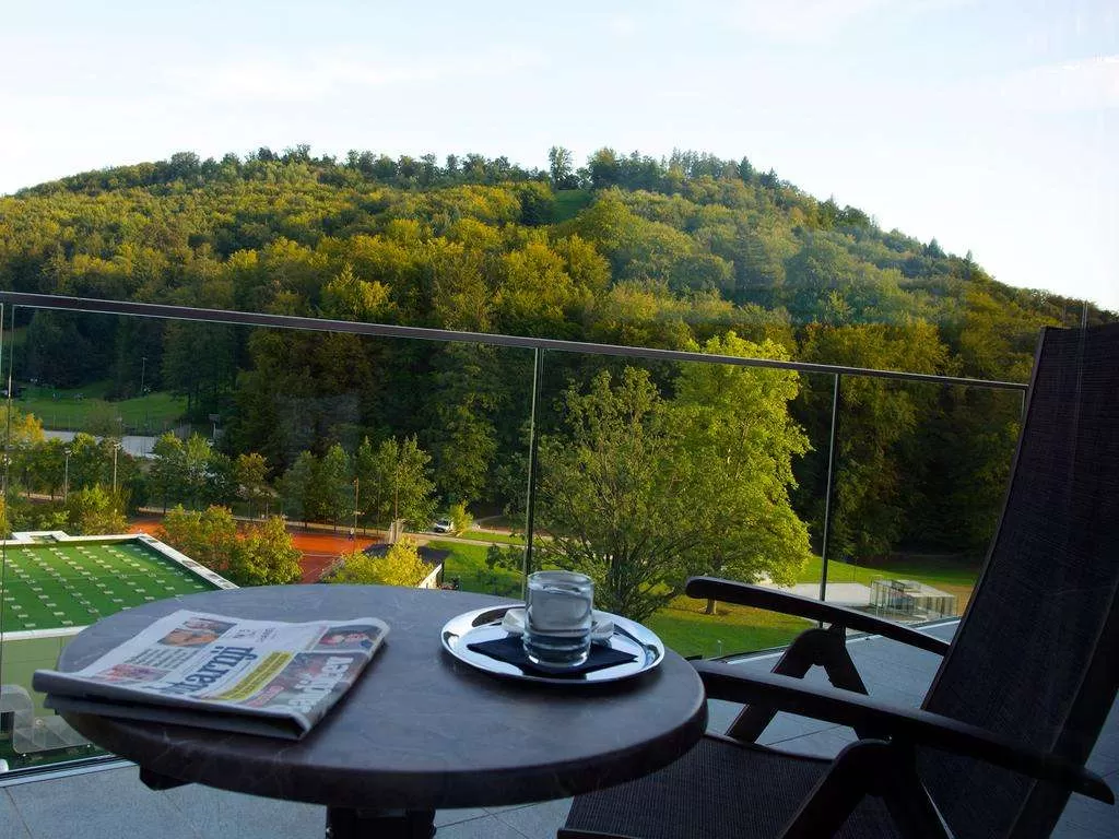 •Двухместные номера Эксклюзив площадью 32 м2 и балконом с видом на парк, большим ЖК-телевизором (55″) и дополнительным креслом. просторная ванная комната (6 м2), из окна которой открывается вид на природу, включает ванну и биде. Один двухместный номер Эксклюзив площадью 26 м2 с просторным балконом (17 м2) на верхнем этаже отеля, с видом на гору Янина, при необходимости объединяется с апартаментами Делюкс.