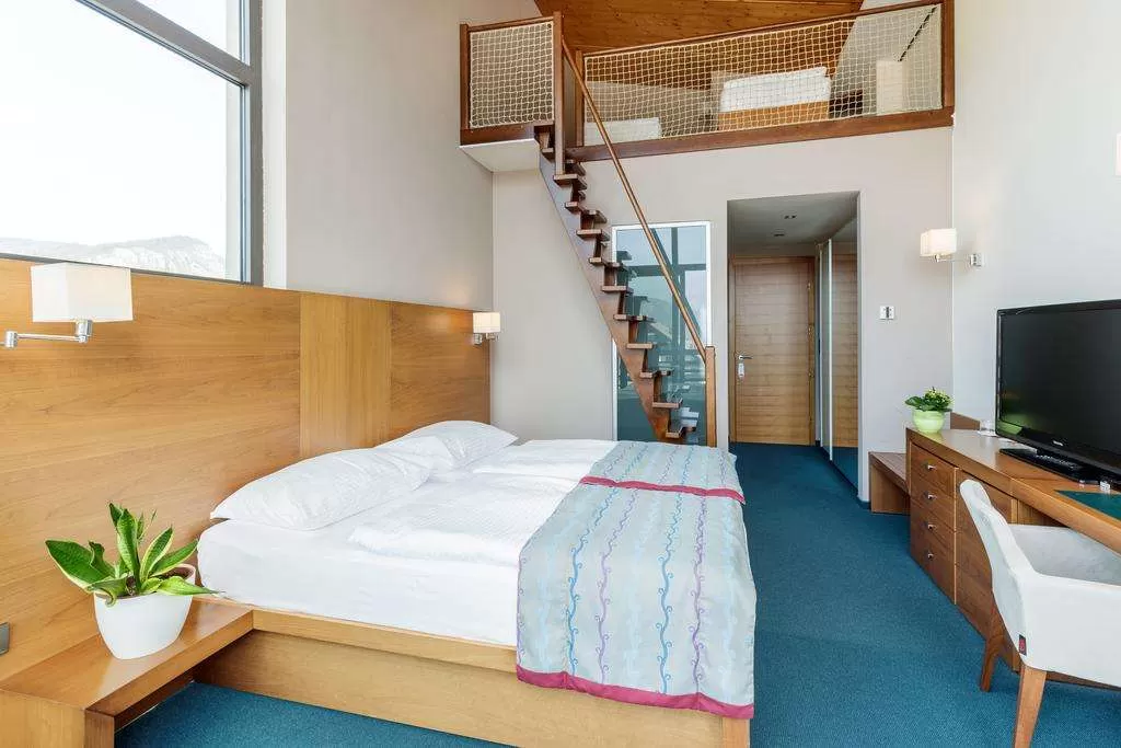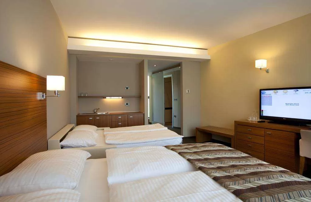 Велнесс и СПА: на последнем этаже отеля расположен элитный велнесс и СПА центр. Велнесс центр предлагает: бассейн, кресла для отдыха, терраса, сауны и помещения для различных расслабляющих процедур. «Аквапарк Бохинь»: работает ежедневно с 09:00 до 21:00. Водный парк (400 кв. м водной поверхности), связан с отелем подземным коридором. К услугам гостей бассейны, с температурой воды 32 ?С и детский бассейн для детей с более теплой водой – 36 ?С. Для более экстремальных развлечений – две водные горки и скалолазание над водой. Также «Аквапарк Бохинь» предлагает: большой и маленький вирпулы, водные массажные кровати, музыкальная пещера и пещера с пузырьками, водопады и многие другие водные аттракционы. В велнесс центре водного парка предлагаются косметические и расслабляющие процедуры: классический массаж, терапевтический массаж, расслабляющий массаж, массаж для интоксикации, антицеллюлитный массаж, массаж с горячими эфирными маслами, пилинг, массаж с мятным шоколадом, горячим шоколадом, массаж с медом. Боулинг: в отеле находятся 5 профессиональных дорожек для боулинга. Возможна организация ужина «Космик боулинг» для организованных компаний. В помещении находится собственный бар, интернет уголок, большой LCD ТВ. Ди-джей обеспечит подходящую обстановку для хорошего настроения. Есть возможность организации частных вечеринок. Конгрессный центр: в отеле 8 конференц залов для деловых встреч, торжественных событий и конгрессов. В залах можно проводить встречи-собрания (до 400 человек). Во всех залах современное техническое оборудование – LCD проекторы, флипчарты, проекционный экран, беспроводной микрофоны, беспроводной интернет, Blu-Ray, DVD плейеры, HD видео, CD плейеры.