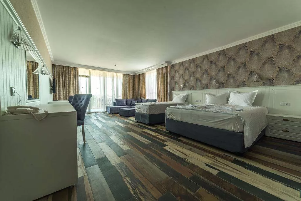 В номере: кондиционер • TV • Телефон• Мини бар /€/• Балкон или терраса /стол + 2 стула/ • Дополнительная кровать • Уборка – каждый день• смена полотенец – каждые три дня• постельное белье – каждые семь дней • На полу – ковролин/плиты.