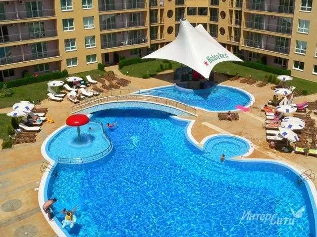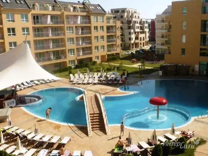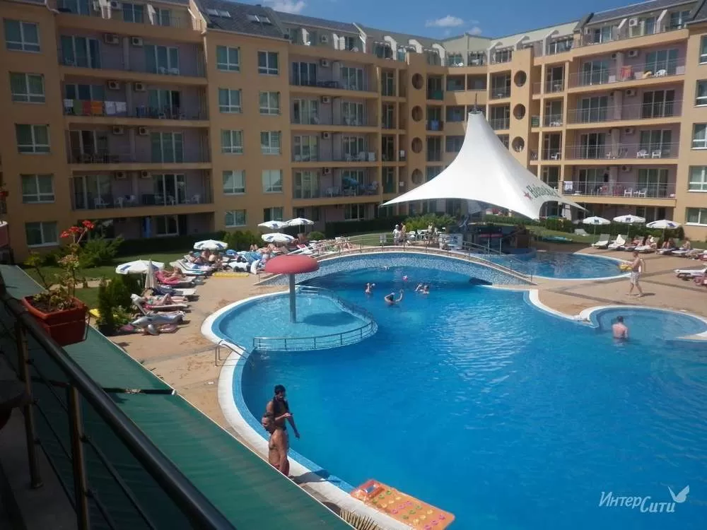 В юго-западной части курорта, расстояние до пляжа – 500, расстояние до центра – 2800 м