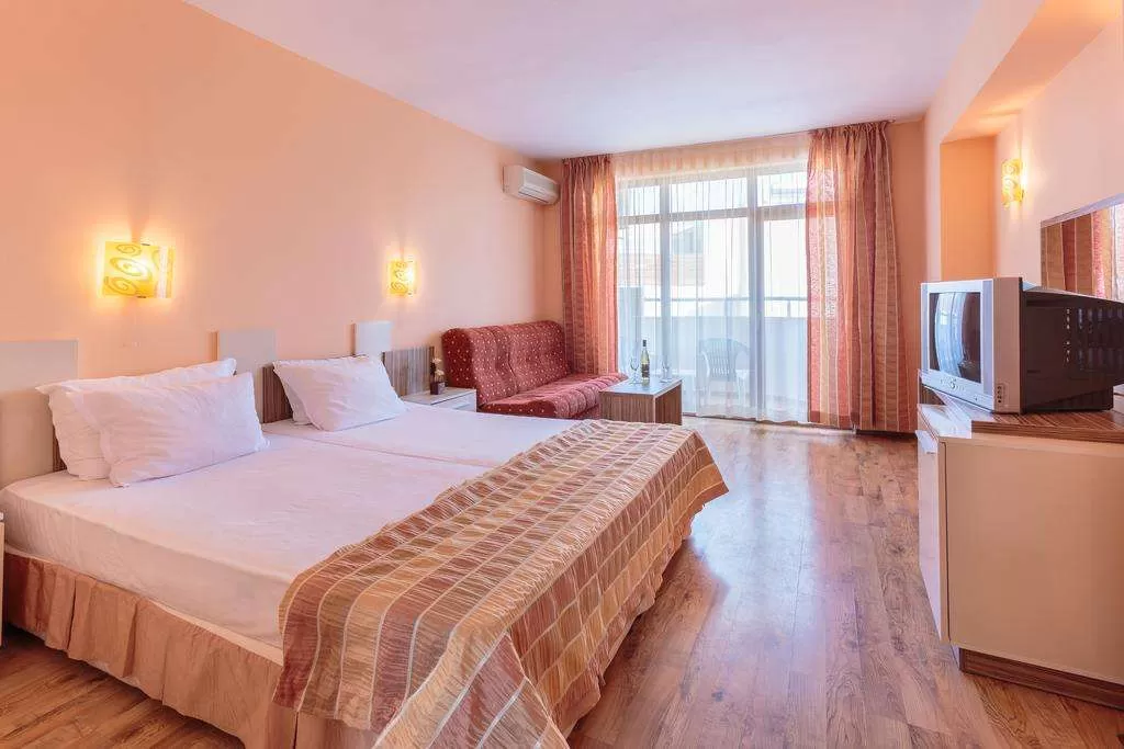 Доп. кровать (диван-кровать); индивидуальный кондиционер; спутниковое TV; мини-бар (за доп. плату); Wi-Fi (бесплатно); санузел с душем; балкон; пол – ламинат; уборка номера – ежедневно; смена белья – 3 раза в неделю; смена полотенец – 3 раза в неделю.Часть номеров с видом на море.