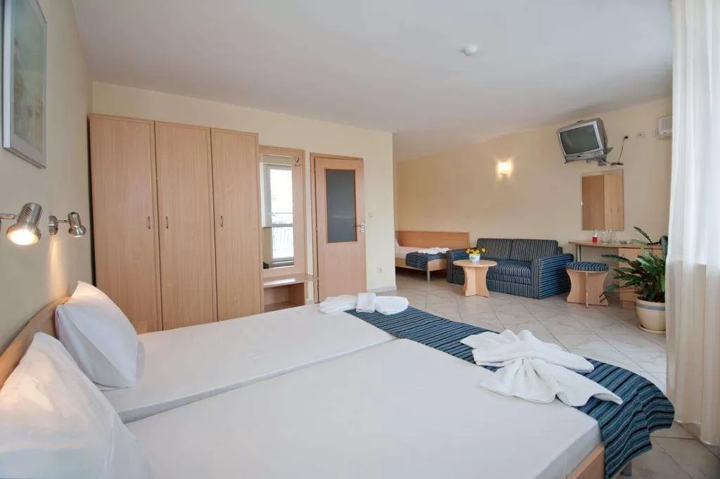 В трехместных номерах: - три основные кровати; - доп. место (раскл. кресло за доп. плату); - кондиционер; - TV; - мини холодильник; - балкон с видом на парк или море; - интернет (wi-fi); - уборка (каждый день) - смена полотенец (каждые два дня); - постельное белье (каждые три дня); - фен; - душевая; - туалет; - полотенца.