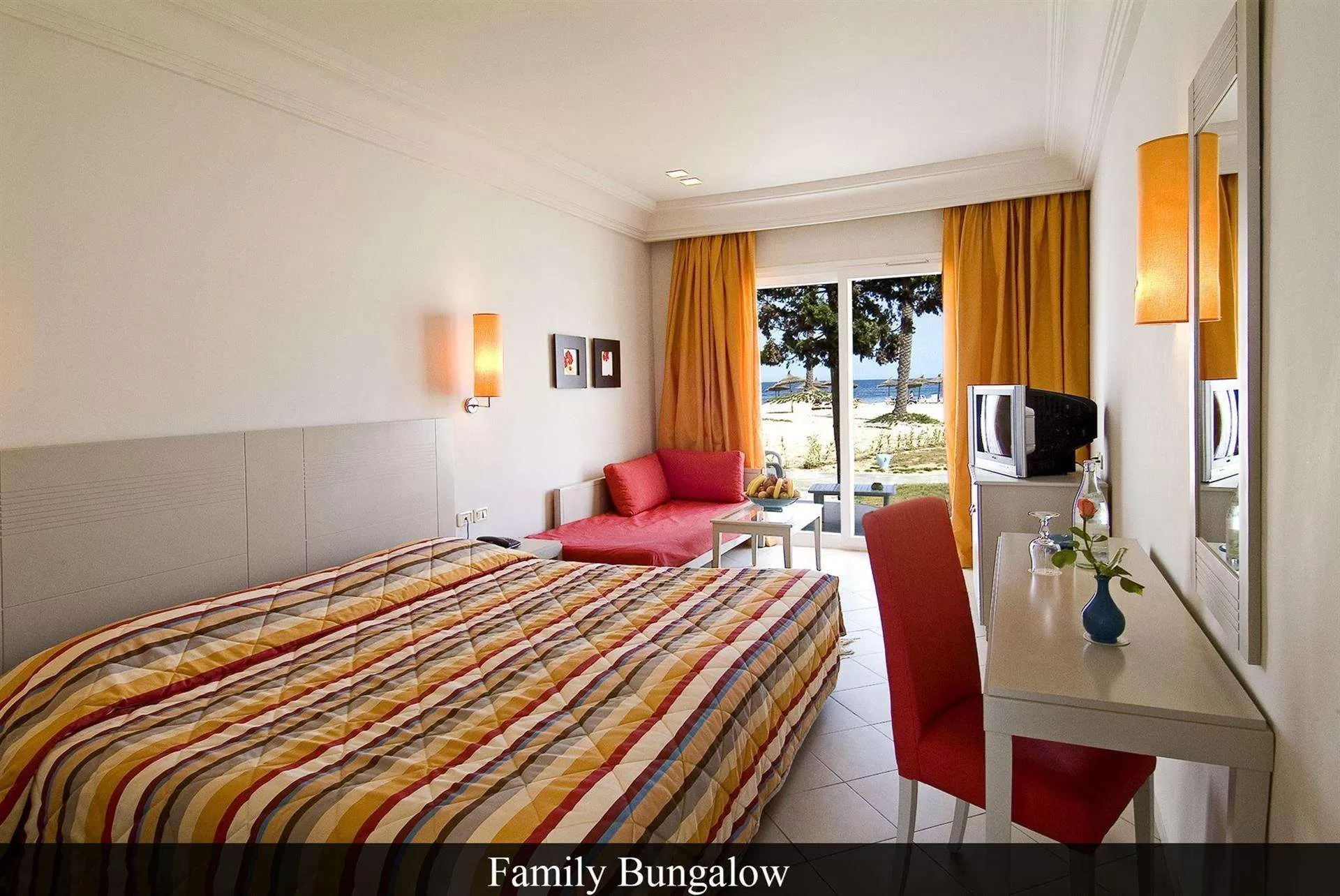 Family Room: 40-50 кв.м., номер однокомнатный, перегородки нет. 4 стандартные односпальные кровати, находятся в бунгало, 1 ванная комната. В номере: ванна, балкон, кондиционер, сейф, телевизор с русскими каналами, мини-холодильник, телефон, фен, Wi-Fi, банные принадлежности. Покрытие пола - плитка.