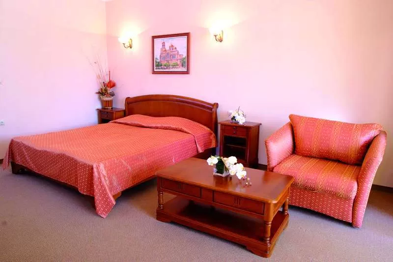 Доп. кровать (кресло-кровать) • центральный кондиционер • спутниковое TV • мини-бар • телефон • сейф (ключ на рецепции) • интернет-связь (бесплатно) • санузел с душевой кабиной/ванной • фен (в ванной) • балкон • пол – ковровое покрытие • уборка номера – ежедневно • смена белья – 2 раза в неделю • смена полотенец – ежедневно.